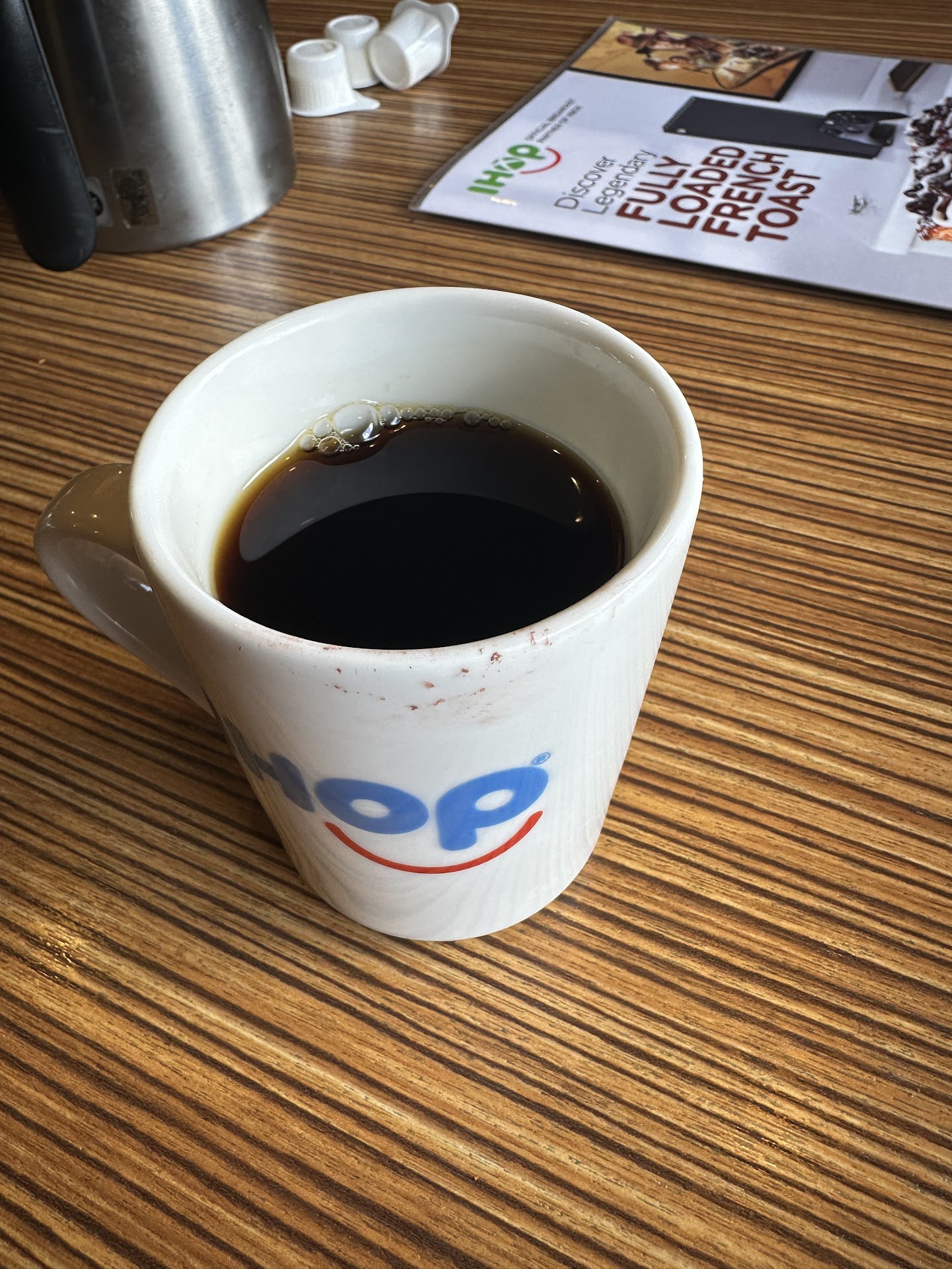 Read moreIt was a long wait and when we finally sat at the booth behind the register, it still took forever for the server to arrive. When she finally did and took our order, without a smile or introduction, the wait for our food and drinks was long. They ended up running out of cups according to her, so half the table had regular cups and the other disposable, which was not really a problem. Another server ended up having to deliver our food to the table. The worst part of the experience though, was as we were waiting for our drinks a fly fell dead on the table. We initially couldn't figure out where it came from but since we were right behind the cashier, and essentially right behind the door we figured it had just come in from outside to commit suicide. But then another half dead fly fell and we looked up and noticed the flies swarming on the light above us. The place was packed so we knew we couldn't get another table. Once the drinks came we were just worried they'd fall in there so everyone was on high alert, then the food arrived in shifts (some got food, some didn't, while others were missing pieces of their meal). We just wanted to leave and as soon as we could get the attention of someone to find our server and get boxes and the check, we left. I should have informed our server about the conditions but considering I couldn't find her until the check came and it being so packed, I didn't bother. Our family of 6 (2 teens and 4 adults) just left the tiny, dirty booth we were squeezed in and took our food home to try and enjoy. It was my worse IHOP...