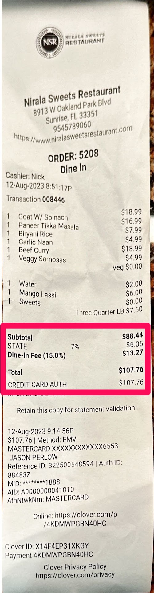 He then adjusted and then charged me a balance of $4 and some change for the take out order. The reason I am writing this down is because I see may reviews who had very similar experience where Nirala is stealing money from their customers by way of such shenanigan's. I think some Florida residents should file a complaint with the county attorney General so the same can be investigate. I invite the owner to respond to this so viewers can read...