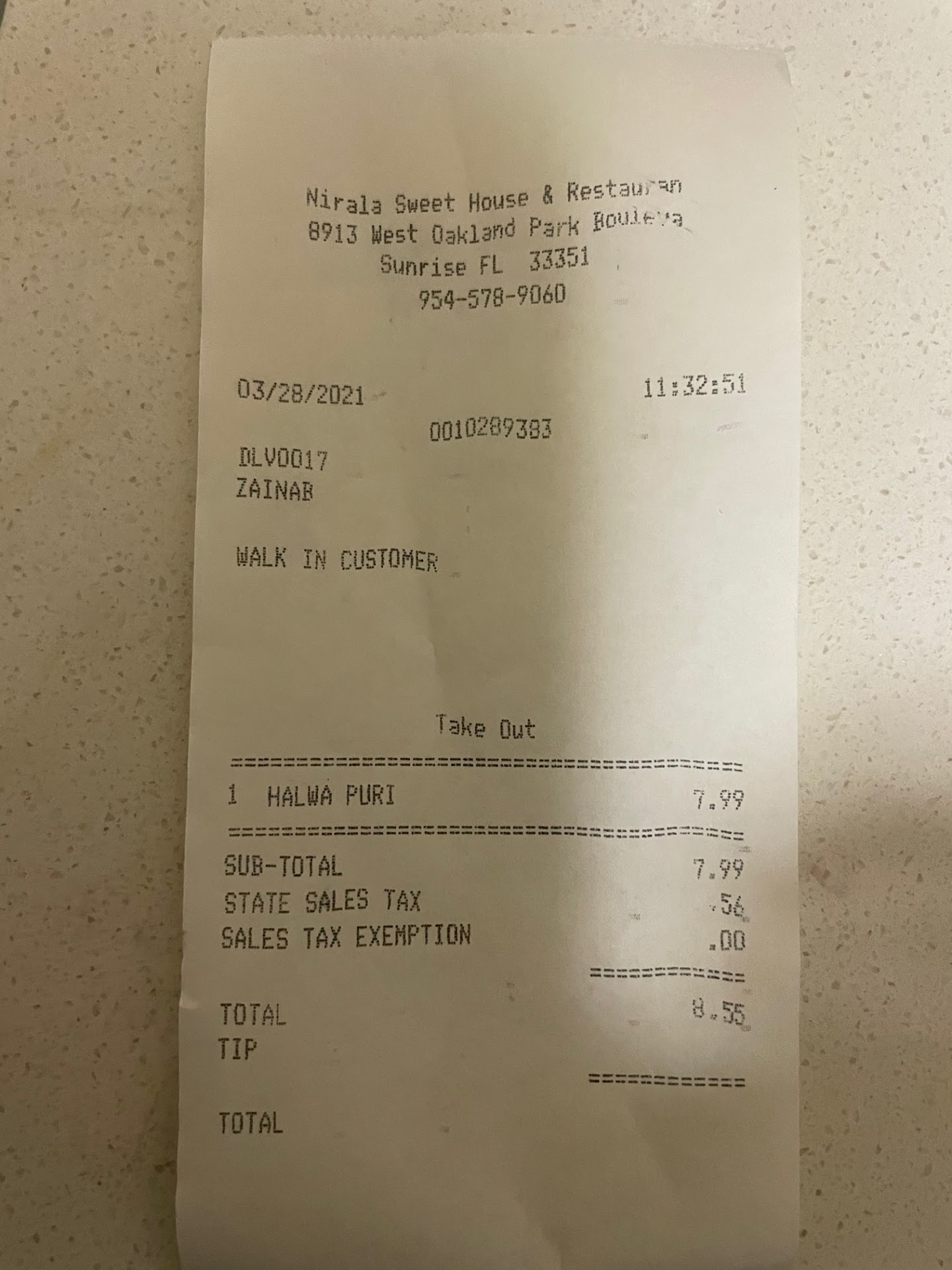 Next morning being a weekend (Saturday), I ordered a Halwa Puri take out so that he would adjust the overpayment on this order. When I reached there, there was another person (with a pony tail), and I asked him how much to which he said $10.16. I asked him how much is one order of Halwa Puri, he said its 7.99 (receipt attached) and then the remaining is tax. I said Florida tax is 12% (as I am basically from New Jersey) to which he said sorry made a mistake and total is $8.56. I then proceeded to show him that I was charged extra previous day so he said he made mistake .