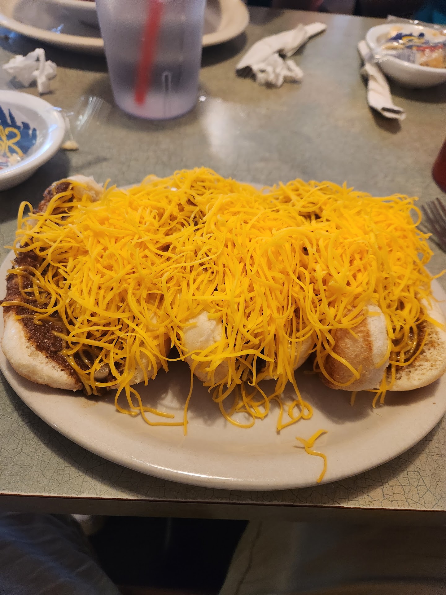 The first Skyline Chili restaurant opened on Price Hill, a neighborhood in Cincinnati, with a view of the city’s skyline, which inspired the name. Initially, Nicholas served his chili over spaghetti or hot dogs, creating the now-iconic dishes "3-Way" (chili, spaghetti, and cheese) and "Cheese Coney" (a hot dog topped with chili, mustard, onions, and a mound of shredded cheese). These distinctive combinations became popular because they weren’t your typical American chili; the flavors were different, thanks to the blend of cinnamon, cloves, and other spices.