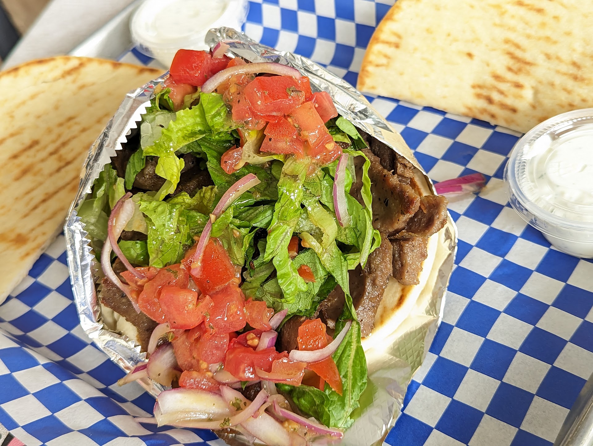 I went here for lunch on a Wednesday. There was ample seating even after a party of 8-10 folks from work showed up right in front of me, but let me go first (thanks!). There were two folks taking orders (one was being trained) and another pair filling them. One gentleman was leading the team shouting order details in a deep voice and telling customers, “I appreciate you” as he handed them their orders. Decorations are Greek Islands themed, whimsical, and aesthetic. There’s even a sign that reads how far away you are from Athens Acropolis and sure enough it is accurate to within 100 miles.