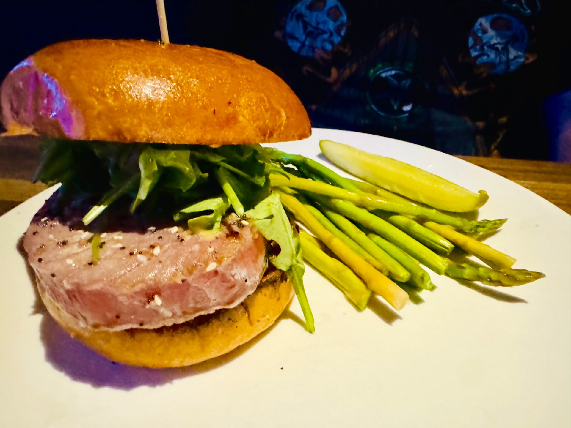 My partner had the “EVERYTHING-CRUSTED” AHI TUNA, which included seared rare ahi tuna, shiitake mushrooms, house steak sauce, arugula, white truffle sauce, and a toasted brioche bun, served with asparagus. While the tuna was tasty, the asparagus was overcooked, cold, bland, and mushy.