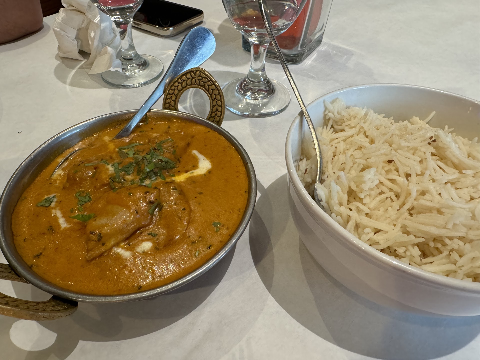 The food came, the same waiter was serving the food to people sitting to my right and in front of me, from my left shoulder side!!! Meaning, as I’m about to take a bite of my food, his arm would be extended right in front of my face serving the person to my right and 3 people in front of me!!! My hair dipped in their food multiple times and was left with curry stains!!