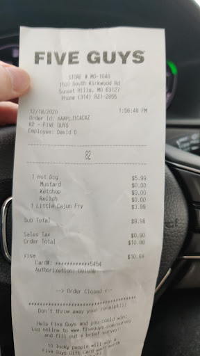 Read moreI eat at Five Guys alot all over the country. This has got to be the worst Five Guys in America. I ordered lunch online today. Upon entering the store to pick it up there were 5 employees behind the counter and 2 other customers in the store. My food was bagged and waiting on the shelf behind the counter. Mind you it was the one and only online order waiting to be picked up. The employees just silently stared at me as I stood in the designated pick up area. When I finally got my food I had to wait for someone to come out the backroom to make my shake?? This man never washed his hands prior to entering the food prep area from the backroom. The milk shake was a warm coagulated cup of brown colored liquid. The fries tasted like rotten potatoes straight out the dumpster. The sandwich had a weird after taste like the grill it was made on was not cleaned properly. These folks are just serving people anything. Thank God I saw a Shake Shack opening up across the street because...