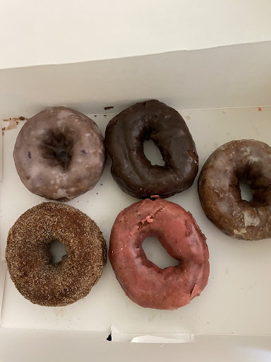 Now on to the food. We ordered four donuts, two cake and two yeast, all with different toppings. The donuts themselves do not stand out as special by any means. If it weren't for the toppings, they would be very average donuts. The toppings overall didn't wow us either. Whipped cream and a cut up strawberry do not make an average donut that much better. I will say, the highlight was the brown butter payslip l pistachio glaze on one of the donuts. I would have loved that glaze on a moist cake. Despite the tasty glaze, the actual cake donut was probably the driest and most disappointing of the four we had. And at $3 a donut, we were very disappointed.
