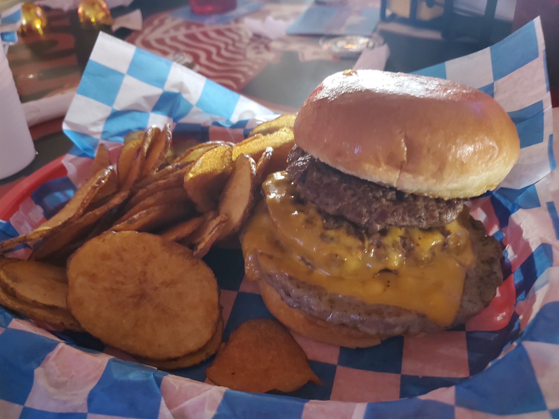 We got burgers. I was expecting a ½lb hand patty but there were two ¼lb patties stacked on the bacon cheeseburger and one ¼lb patty & two ⅛lb patties on to the Wisconsin burger...?? I'm not sure if that's how it was meant to be a another photo doesn't show that. The patties tasted similar to Sam's Club burger patties. They weren't terrible but lacked flavor and dripped in fat. The fries were not thick cut, they were shoestring fries. They had good flavor but we went there because of the photos of the thick cut fries and I personally don't like shoestring fries so to pay an extra $3.99 for something I, once again, thought I was getting was disappointing. The chips were good. The coleslaw was...