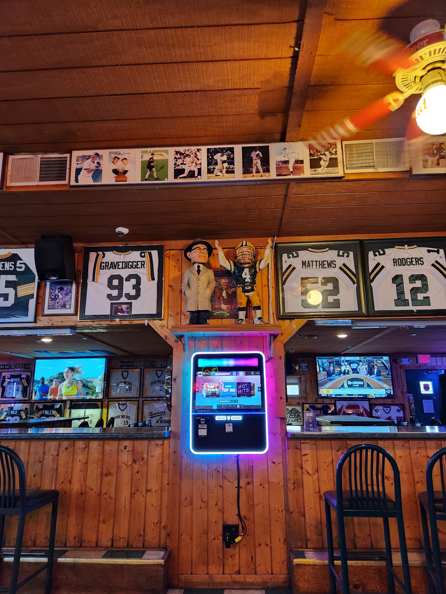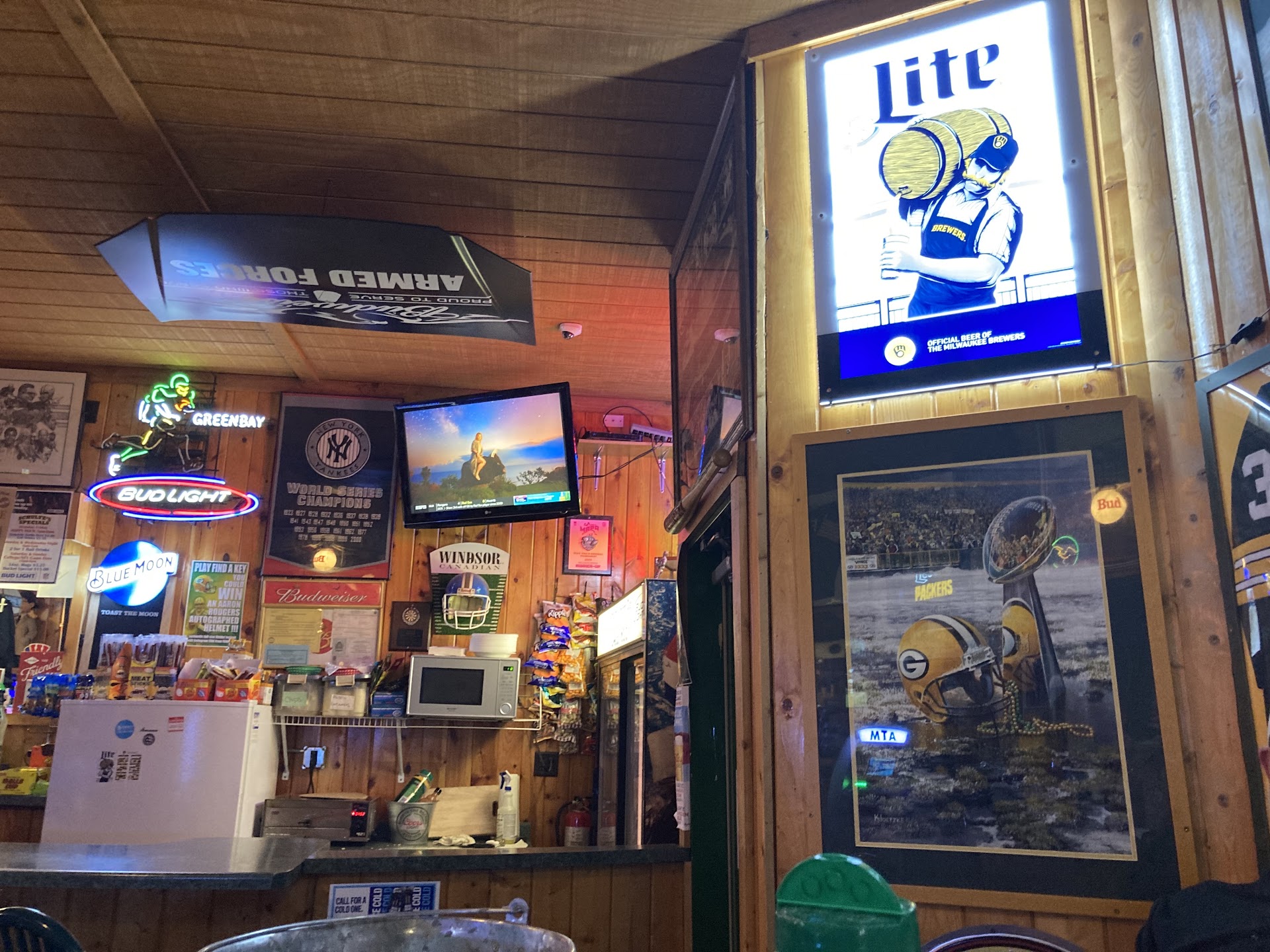 2 words, Pickle Beer! That's right, order yourself a 42 ounce beer of choice and ask for a pickle spear. They'll drop one in, no extra charge! I haven't eaten food here before but have been here many, many times for drinks and good times with friends. They got pool and darts and music. The usual but also a rockin collection of Green Bay Packer stuff all over! Great place to watch the Packers play too but that goes without saying. Of course, being at a bar, you'll have to deal with a few rowdies now and then, the occasional way too drunk guy who wants to strike up a barely coherent conversation with you but it's all good! You're half in the sack anyway and have another fresh pint in your hand! Let loose and have a good time...