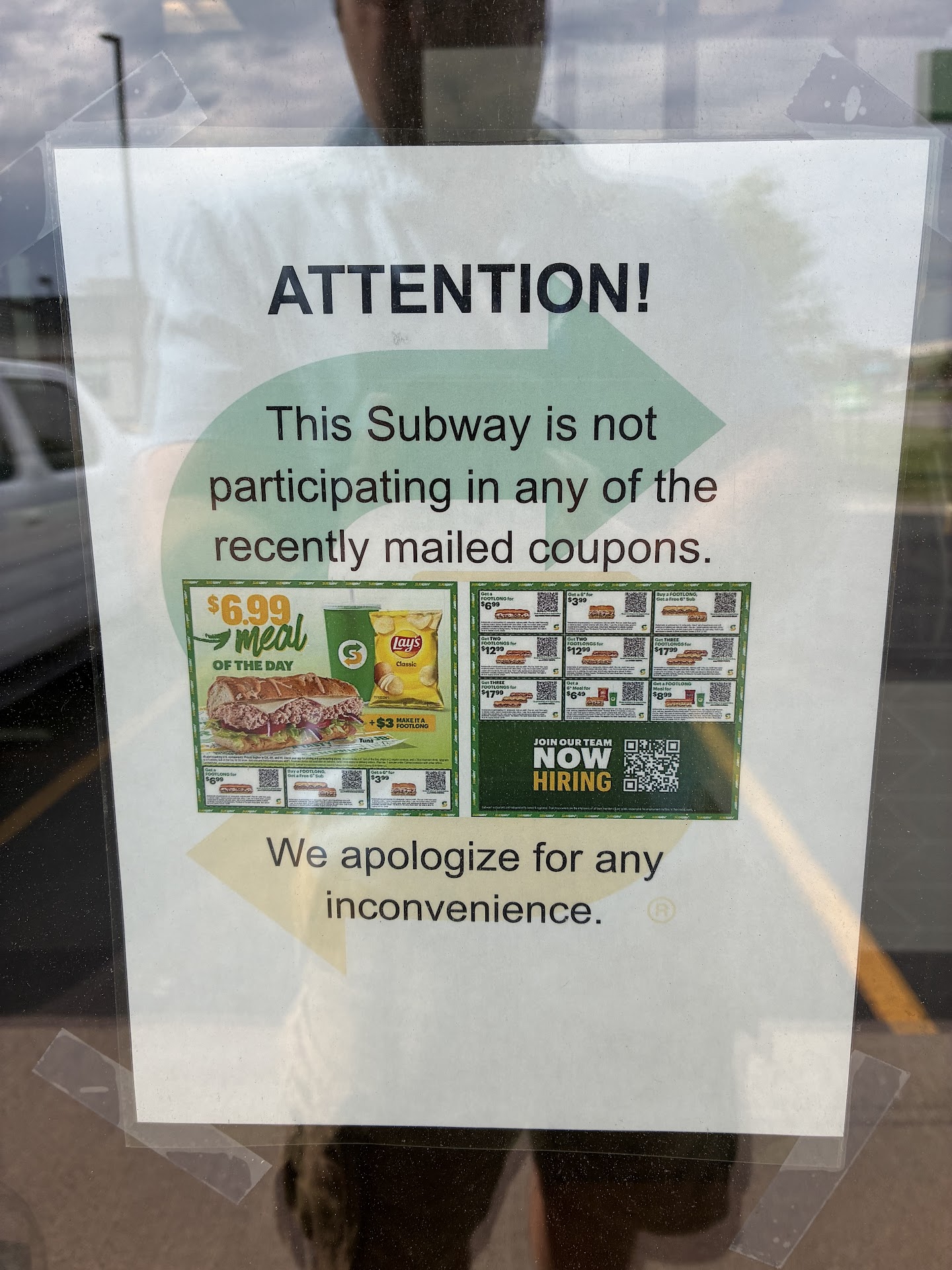 Read moreWent through the drive thru 9/11/22 @ approximately 7:10pm. Tried to order and all I got was static on the speaker, so I drove through to the window thinking it was a speaker issue, but instead was met by a young girl that was dripping with negative/sarcastic attitude. She stared more at her nails than making eye contact with me. She said the drive thru now requires the customer to use the touch screen to place an order. if that's the case, then what's the point of a drive thru? What if I have a question about my order? Where's the human contact? Worst lack of customer service ever. There's two other Subways in Superior, and NEITHER one of them could be any worse than this one on Tower Ave. If this app could let me give this a zero stars,...
