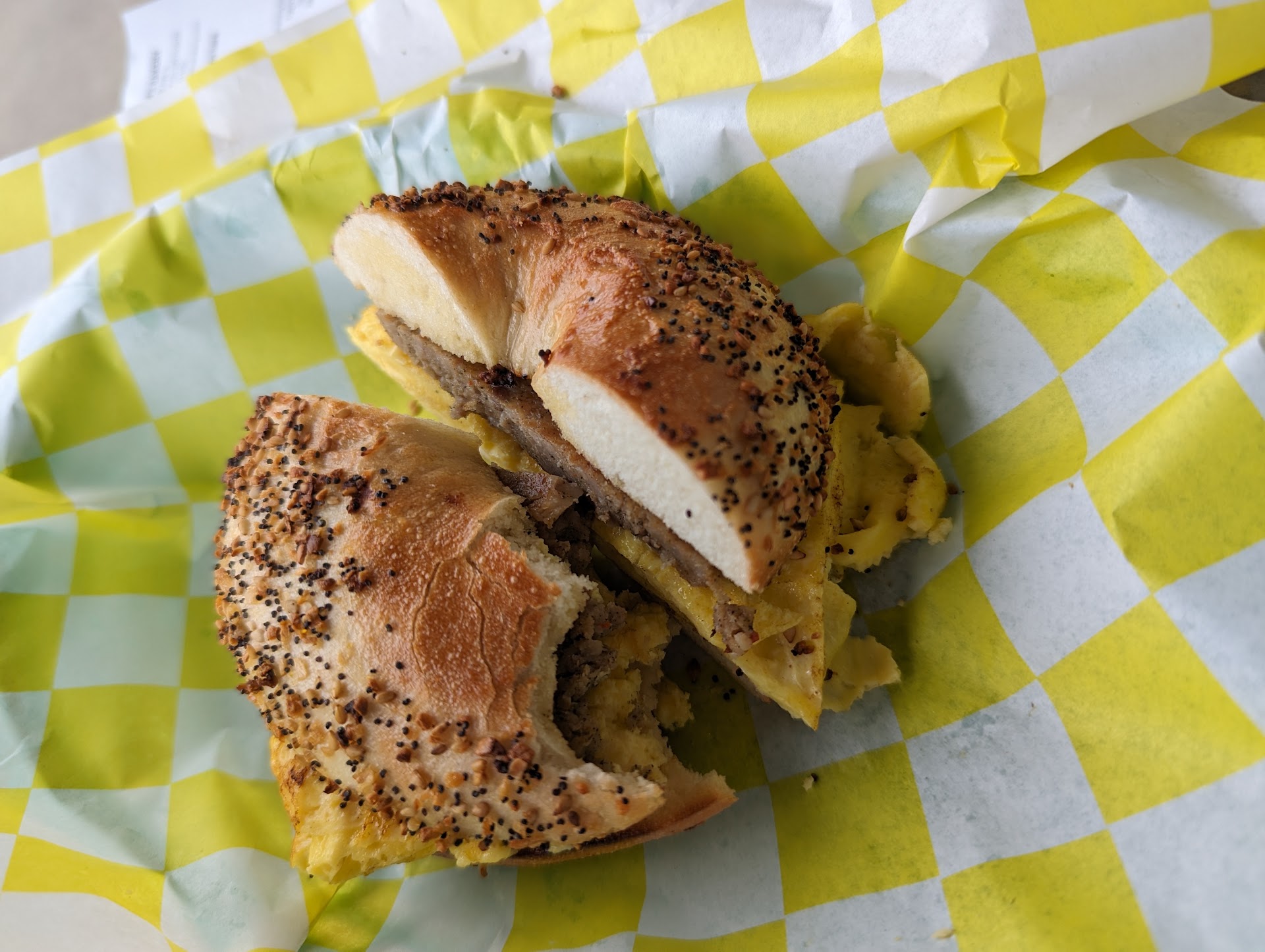 I got an egg and sausage on an everything bagel and my husband got a nine grain bagel with jalapeno cheddar cream cheese, egg and sausage. The cashier delivers the food to you and, in our case, he gave me my husband's bagel and I didn't realize it and took a couple of bites before my husband figured out our plates were switched. I really didn't care for his lol.