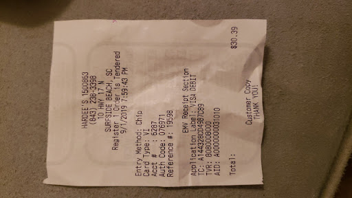 Read moreFor lunch today we decided to go to Hardee's because we don't have one near us & we like going there when we're out of town but oh my god after today we'll never go again. It took 18 minutes for our food to come out then they gave it to the wrong person. We got no apology or explanation as to why it took so long. We didn't get a receipt until after outer food came out & when I looked at it I noticed that my daughter's chicken tenders were $7.39 when the sign said chicken combo $5. I asked the lady at the counter why it rang up so much & she seriously said in order to get the food for $5 I had to tell her I wanted it for that price. I asked her what the difference was & she again told me I have to tell her I want the discount when I ordered. I've never even heard of that before. Most places if the sign says $5 you get it for $5. I would've asked for a manager but my stomach was starting to hurt from eating the terrible food. I swear I will never spend another penny at a Hardee's as long as I live. I have contacted corporate & posted on every social platform I can....