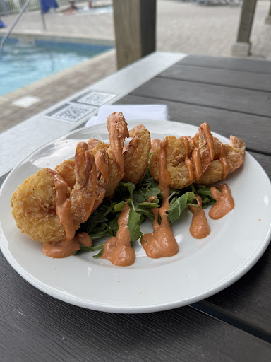 Meh. A detailed review of my mediocre experience. Let’s start with the good. The bang bang shrimp were excellent. Every local seafood restaurant has their different version of this, and these shrimp were large, larger than most. The happy hour special for them was $11. Not super cheap, but not bad for quite a few large shrimp. My drink was OK, but too expensive for what it was. I got a Bahama mama, and it just tasted like a regular rum punch. My partner bartended for a long time, and he used to say if the bartender did not know the drink well, the rule was “rum, make it red.“ Here at the beach, it seems to be “rum, make it peach- colored.“ It’s just tricky, because my hometown has a lot of wonderful cocktail bars with great mixologists, and so they are squeezing their own limes etc. But here, everything is a mix. I was looking at their margarita, and it said “sour mix“ and if it’s $13 for a drink, you should have some sort of fresh squeezed lime in there, rather than just what seems like some rum and some juices. I even asked to see one of the juices that went in one of the specialty margaritas, and it was a premix. So I ordered the Bahama mama, thinking it may be a little bit more special, but all these rum punch drinks sort of bleed together. But usually you can get this level and type of drink for Eight or nine dollars, so for $13 I expected something more special. It wasn’t. It was boozy though.