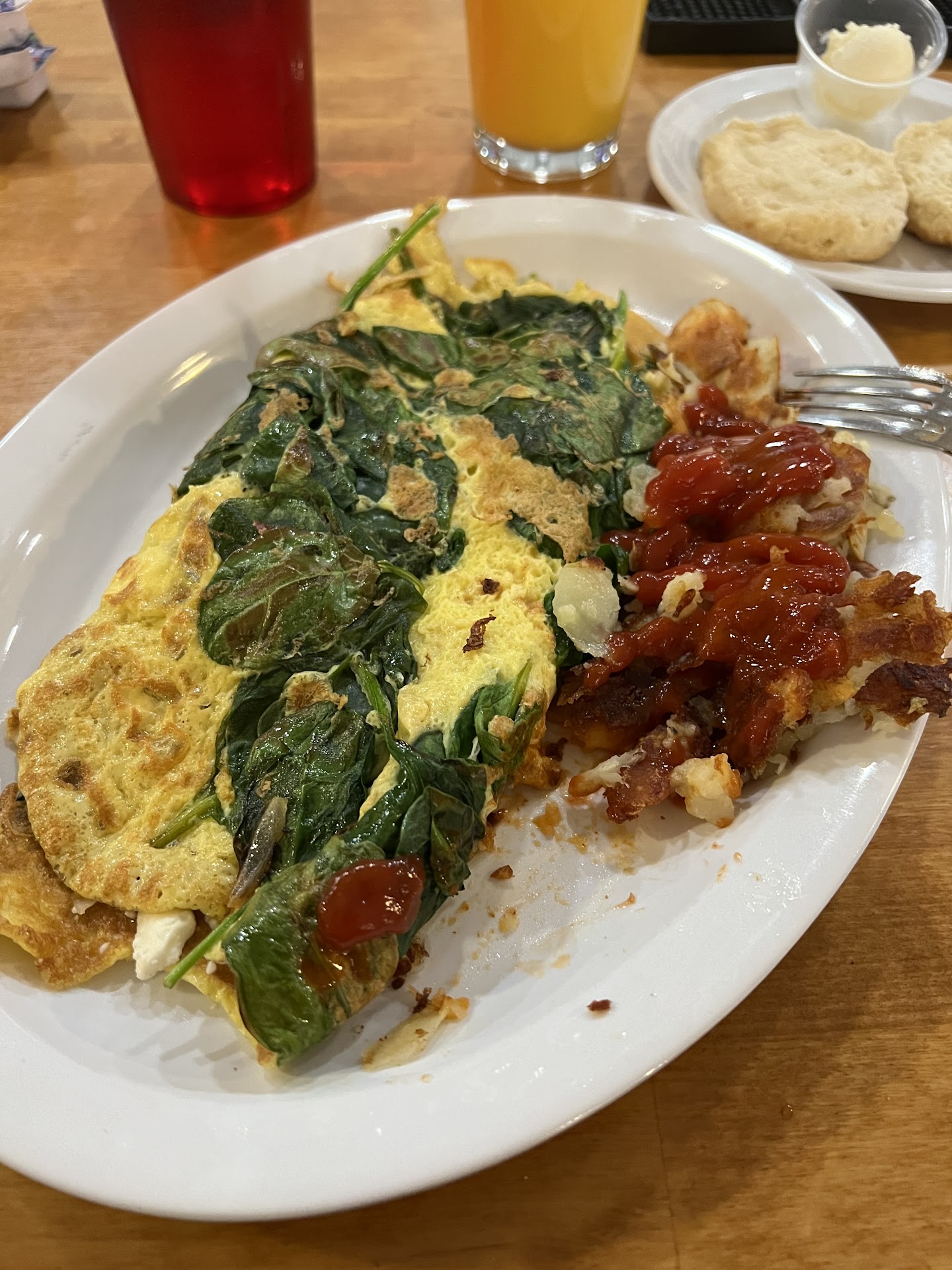 Four + 1/2 Stars 🌟 with my first visit for breakfast on Sunday, February 23rd. Took a seat at the counter as they were busy, and people were waiting to sit at a table. The menu is rather large with a lot going on. I settled for the Spinach & Feta Omelet that came with home fried potatoes and toast (biscuit). $13.95. I had water and a large O.J. ($4.25) with my meal. The omelet was fine. Fresh spinach, and feta cheese. Not a fluffy omelet as it was prepared on the griddle. Still a large omelet made with three eggs. I thought I’d try the cinnamon roll. That was a mistake of monstrous proportions, because it’s HUGE! It was good; with loads of icing. Others oohed and ahhed at the sight of it. Honestly, you could feed four on this monstrous treat ($8.99). I boxed the pastry for home. Before settling my tab I ordered two soups To Go. The soup of the day was lemon chicken and rice soup. The Greeks would call this Ovgolemono soup. They were $4.79 each for 16 oz servings. Well worth taking home, and easy to reheat. The soup is delicious. Everything was enjoyed, and the service was very good. Total before tax was $36.77. Parking is ample as it was Sunday. Seating is spacious, and the restaurant is clean; including the restrooms. This was a very nice discovery as I’m new to the area. I’m looking forward to trying more of the menu.