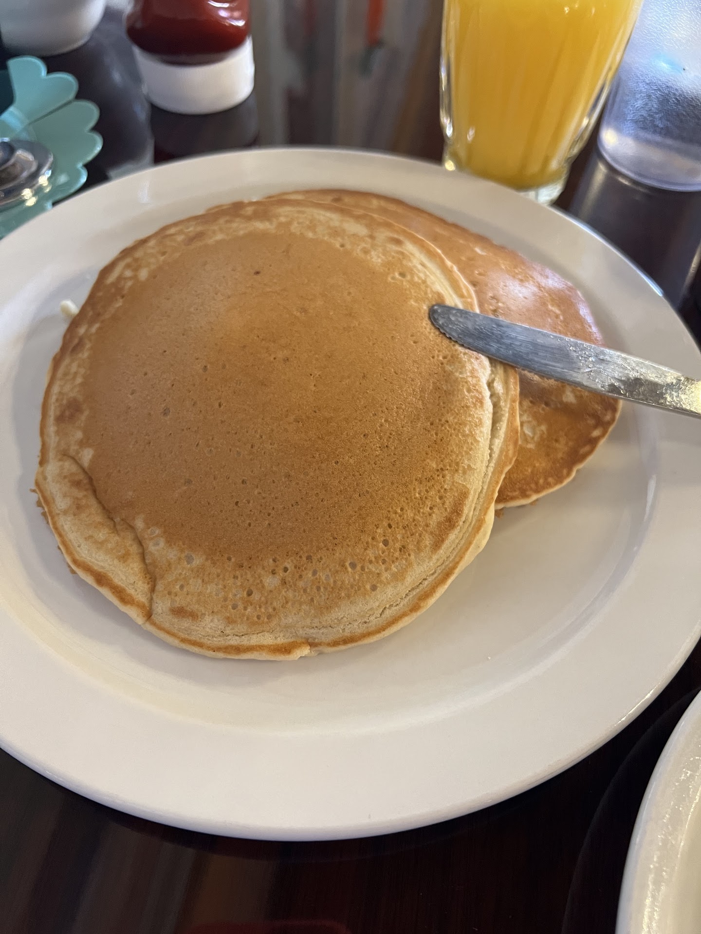 Looking for breakfast, and have never tried this restaurant. This place is situated in a retirement community. Once getting through the gate with a visitors permit, that was the only wait as there was plenty of open seating. Hillary was my server. Very pleasant and attentive. I perused the menu that had a variety of options. I chose the pancake platter (full order) which came with a stack of four cakes, two eggs, and two sausages (bacon was another option). The eggs were prepared just right - over medium - and the sausage was fine. Prefer not having the links split down the middle, and will keep that in mind next time. The cakes tasted peculiar. They seemed package like batter, but turns out they’re made from scratch. What I thought might be cinnamon was really orange zest. The consistency was also like that of wheat cakes. Couldn’t think of the flour that was used, and was told it was self rising. Nothing terrible. If I have this again I’ll go 1/2 an order as four cakes was too much. To drink I had water (easy ice), a large orange juice, and coffee. The juice was fine; and the coffee was good — slightly bitter. Hillary was kind in bringing extra packets of sugar, butter, and syrup upon request. A very pleasant...