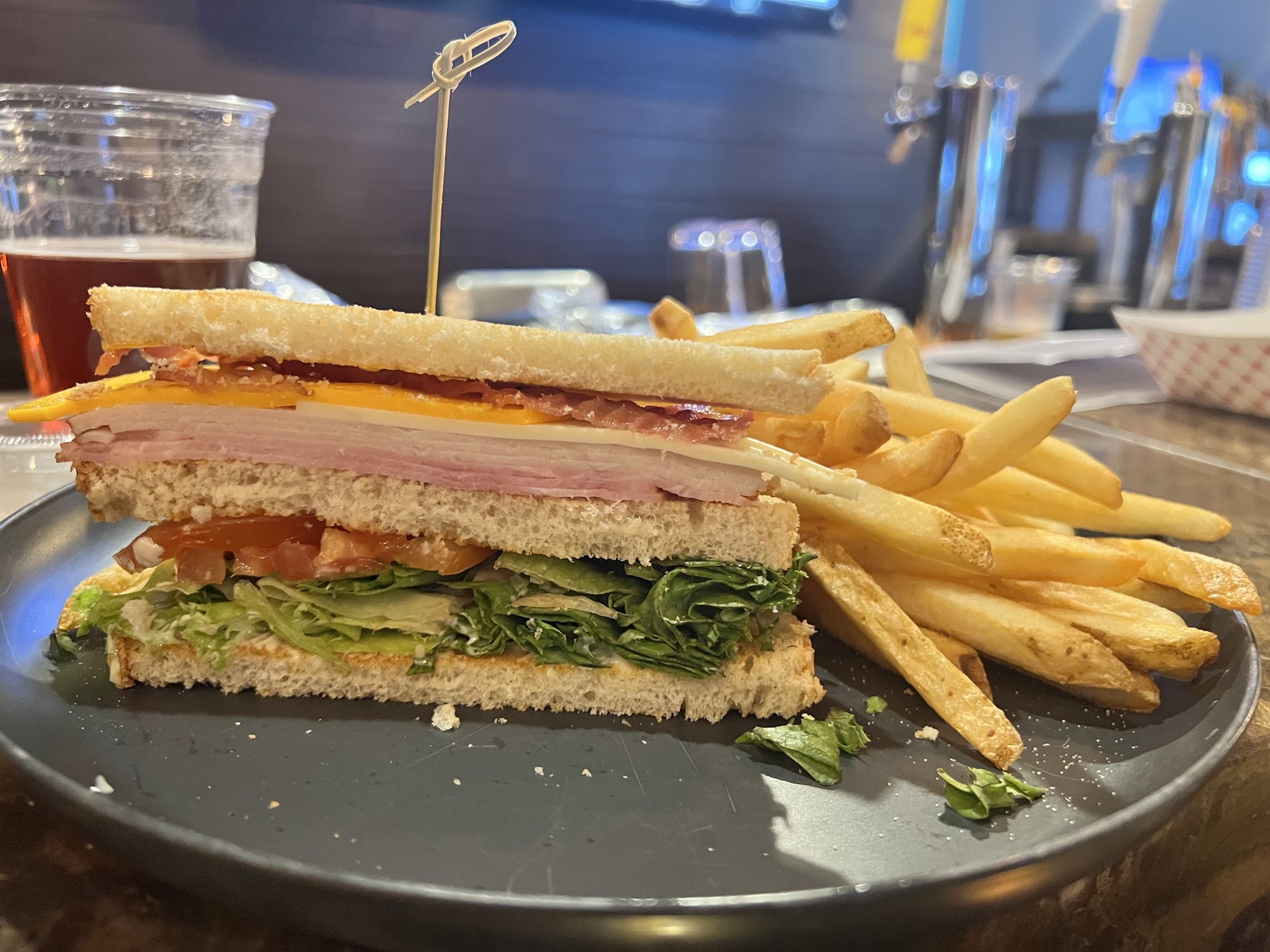 Read moreOkay, hear me out. I’ve lived in Surprise for many, many years and have been pretty much everywhere sports bar/grill wise. Yet I’d never been here until today. It is open to the public but does give off the impression of older community with the gated area etc. however you can reach the restaurant before getting to the actual community entrance. Parking was no issue, but layout was a bit odd. Signage did direct us to the bar. We arrived of seat yourself signs. One side is TVs and more restaurant vibe and other bar are and a few other tables. It’s dark, a bit dingy looking and definitely could use an update. Our bartender came over quickly and gave us some menus to look over after asking us if we’d like to order food. I was surprised to see quite a few craft beer options including not one but two sour beers on tap. I was a bit more impressed with that. She let me sample both and after choosing one she let me know it would be free since they were out after that and couldn’t fill it all the way. Score. However both our beers came out in plastic cups. While not the worst option I’d of preferred a chilled glass. We decided on a club sandwich with waffle fries and a side garden salad with ranch. It all came out pretty quick. Sandwich was good but basic. Fries could’ve been a bit crispier but still good. All utensils were plastic throw away items. Salt and pepper in packets. They definitely don’t want to do dishes here I guess. Good was a bit pricy, but beer was priced great. Service was ok, but the younger girl with the glasses helping put things away was the friendliest and has great customer service and welcoming vibes. Lastly the restrooms aren’t even inside the restaurant we had to go outside and around the front of the opposing building. Odd layout. All in all I’d say about 3.5. If you’re local and wanted to walk over for a drink and quick bite or are playing the course it is a decent stop, but could definitely improve. I’d come back to try...