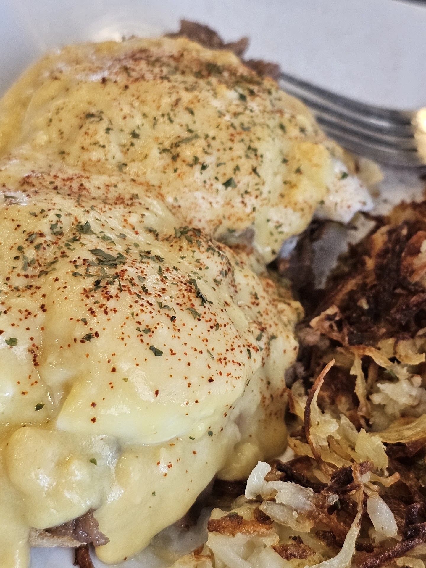 The first impression of this place was poor, to be very honest. I ordered a "fancy coffee" and the steak benedict. In my first order, the hollandaise sauce was on the verge of broken, lumpy, and grainy throughout. The eggs were "hard" poached, instead of soft, like a traditional benedict is supposed to be. (In my opinion) The hashbrowns I ordered crispy, and the line cook must have had a bad day or lost focus at work. They were scraggly pieces of potato that had the mouth feel of eating a handful of sticks instead of a solid piece with each side cooked to a crisp but softer in the middle. How it is supposed to be (in my opinion). Theresa was the star of the show, though. She recognized the poor quality right away and made it right. She was a delight! The second set was much better. Eggs poached soft, hollandaise is still questionable, but overall, it was okay. 👍 Hashbrowns returned in a uniform piece, cooked crispy. How they're supposed to be. Overall, I probably will wait to come back as the price point + quality just isn't there yet. I do respect the discount on cash transactions as advertised up front, but I do not like how the CCTV camera shines a blinding light in my face as I stand to be seated. Perhaps I will try again in the future, but don't take my word for it. Get out and see yourself.