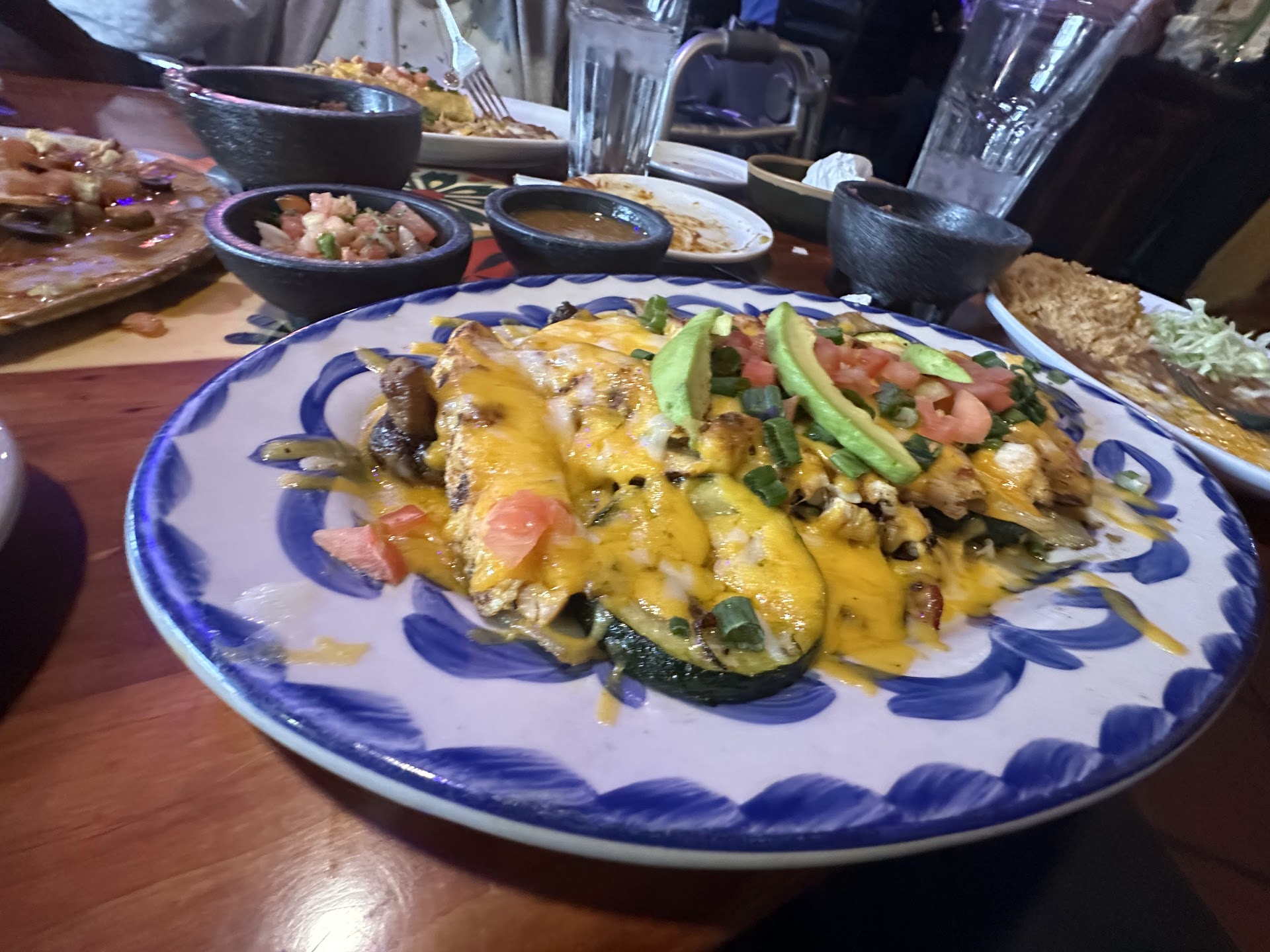 The plates are not just meals; they’re masterpieces. Every dish that arrived at our table was a visual stunner—bright, bold, and overflowing with flavor. The vibrant yellow and orange cheeses melted perfectly over grilled vegetables and tender meats, crowned with fresh avocado, diced tomato, and green onion—each color singing in harmony like a mariachi band in full chorus.