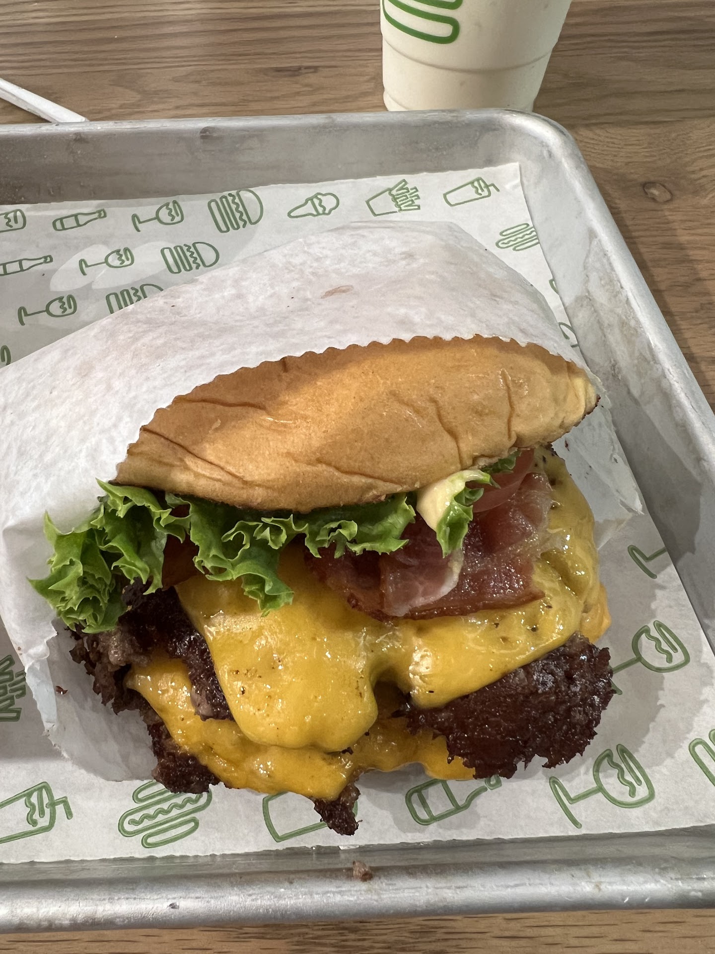 Read moreIâve passed by this when they were building it. On Monday night I had the chance to visit, and try their burgers. Itâs nice to see theyâre open late. Parking was no issue as I came around 10:30pm. Walking in there were four kiosks to order from; no one was working the counter. Iâm not one for ordering from a kiosk as I donât know the menu; plus I wouldnât know any specials â like In n Out with their secret menu. I ordered a Double Shack Burger with Bacon, an order of crinkle cut fries, and a vanilla milkshake. My check came to $24+change after tax. I grabbed my placard with its number, and took a seat. The dining area is fairly clean, and offers booth and table seating. The wait wasnât long, and when my food arrived I started with the milkshake. It was very thick, and had good flavor. Only one size too. To drink the shake I had to remove the lid. The french fries were ok. Not a golden brown crisp. I donât know when they had filtered the oil in the fryer. They werenât soggy, but could have used a little salt. The burger was your standard smash burger. Two patties with a good char; with cheese, lettuce, tomato, and onions. The bun was very nice, and held up well. The prices are a la carte; so itâs more than In n Out, Habit, Wendyâs, Burger King, and Village Inn. Iâm not sold on returning here based upon this experience. Only factor that, in desperation, would influence me are the hours. Before leaving I will say they are pet friendly as a woman brought her cat in with her; and the bathrooms are fairly clean. For more of their menu Iâve attached photos. If youâre in the mood for a decent burger,...