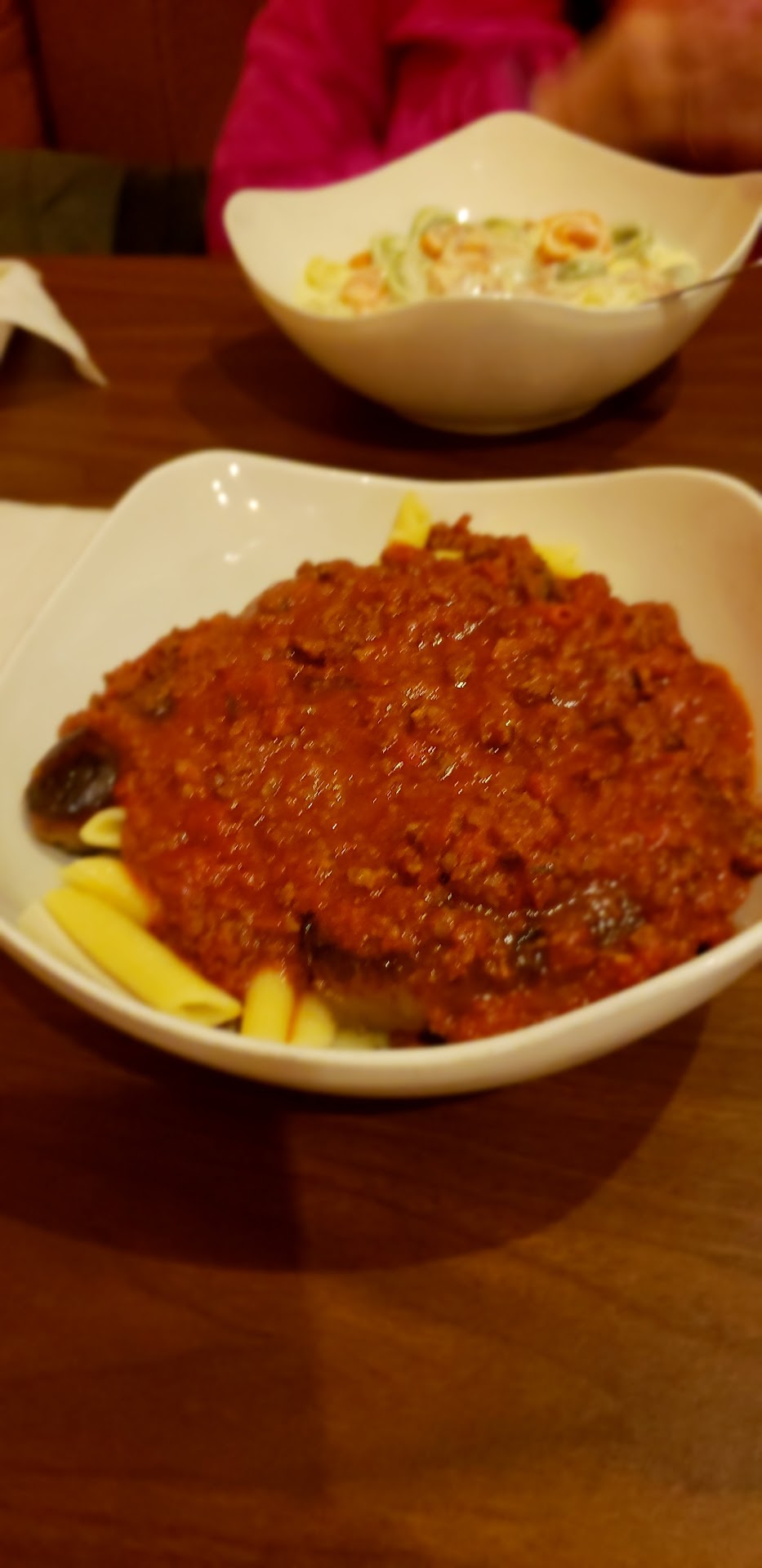 The pasta dishes were generous, and if anything a bit heavy. For example, had i known how much ground beef was in the meat sauce, I would not have added sausage to the order. Seriously, the meat sauce is like a sloppy Joe! The bread sticks were fresh and warm and useful in cleaning the sauce from the plate.