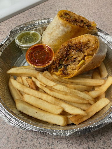 When I ordered Al Pastor style, the server let me know that with that style of meat, they cook it with pineapple chunks. That was kind of new to me, but I wanted to try it. I ordered it with no sour cream, and it was put on the side just in case I wanted to add it later. The burrito was freshly made, piping hot, and full of flavor. The ground pork was well-spiced (but not too too spicy), and its flavor went well with the sweetness of the pineapple, which was not overpowering. The rest of the filling; rice, black beans, onion,, pepper, and corn, was tasty. They included two little pots of sauce - one red that with quite a kick, one green that was pleasantly milder - but I did not use them for the burrito. I used them for my fries, which were well-cooked, but otherwise plainly salted.