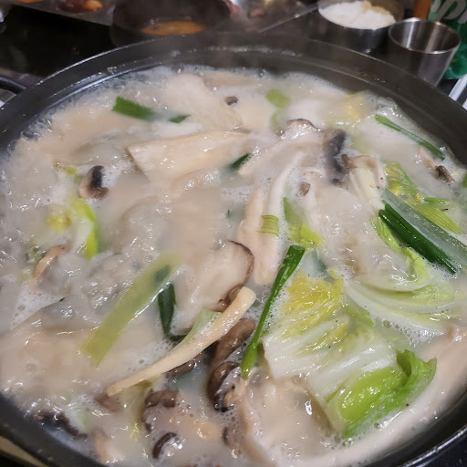 Since we wanted something extra besides just meat, we also ordered the dumpling hot pot. Because it was late at night, we opted for chive dumplings instead of kimchi dumplings. The dish came with a rich beef broth, mushrooms, dumplings, and rice cakes. Honestly, I was already full when my husband suggested ordering another dish, and I was a bit annoyedâbut once I tasted it, I couldnât stop eating! The dumplings were packed with flavorful filling, and the combination of mushrooms and broth was simply amazing. We ended up finishing almost everything, but we still had a little broth and rice cakes left, which we packed to go because it was too good to waste.