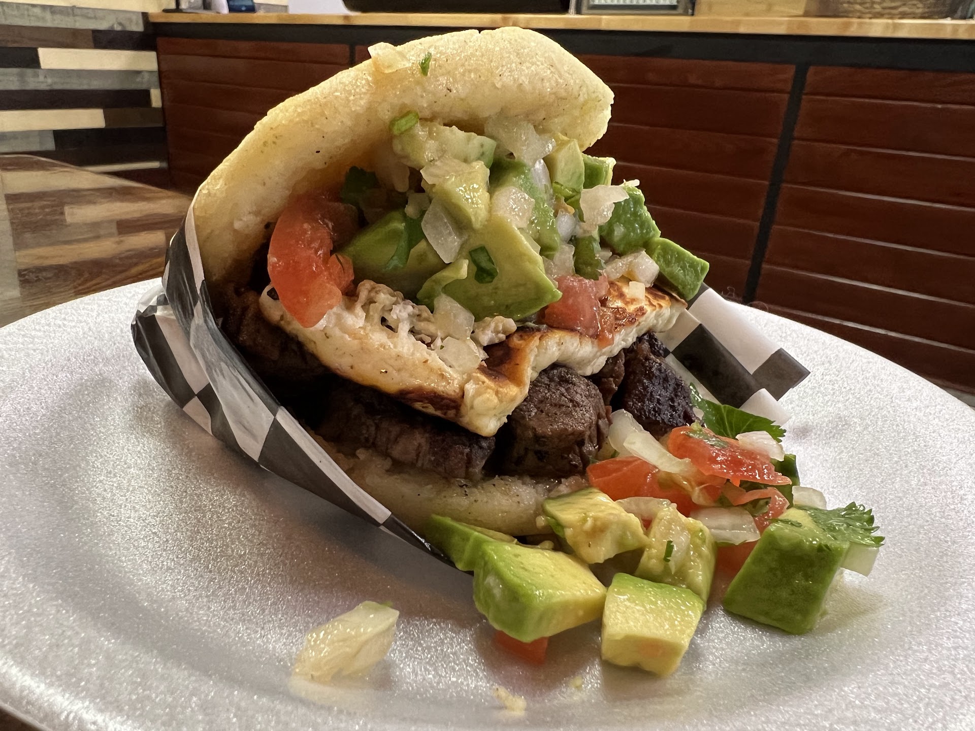 Dios mío the arepas were soooo delicious. We ordered grilled beef and it was well cooked, well seasoned… TODO. The arepa itself was its whole own butter flavored dish that you probably wouldn’t been full with. Then the meat was well done but not burnt. It was juicy to the bite but firm. The fried cheese in the middle looked a nice crisp brown around its edges and was a strong consistency. The pico the gallo was chunky and I actually felt full from 2/3rds of the arepa plus half an empanada, which was surprising.