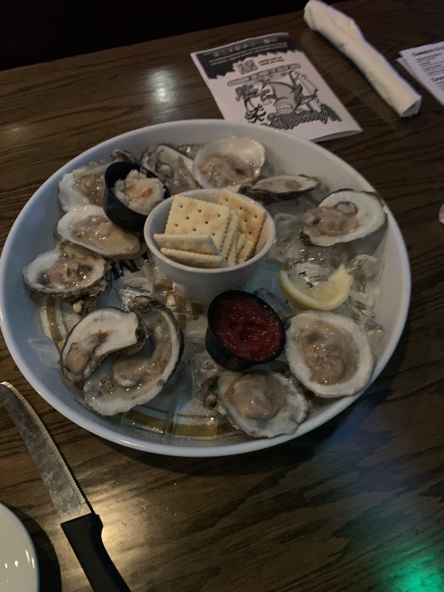 Got there around 8pm I informed our server at the time that we had two extra people joining but they were gonna be late. We ordered a drink each with two appetizers. Everything came out quick and was delicious. The oysters were perfect! We also ordered the shrimp Monterey. I don’t really like the texture of mushroom but I love the flavor. My friend ate the mushrooms I picked at the shrimp and sauce. It was so flavorful. They served it with some toasted bread which I dipped in the sauce. Soooo good!