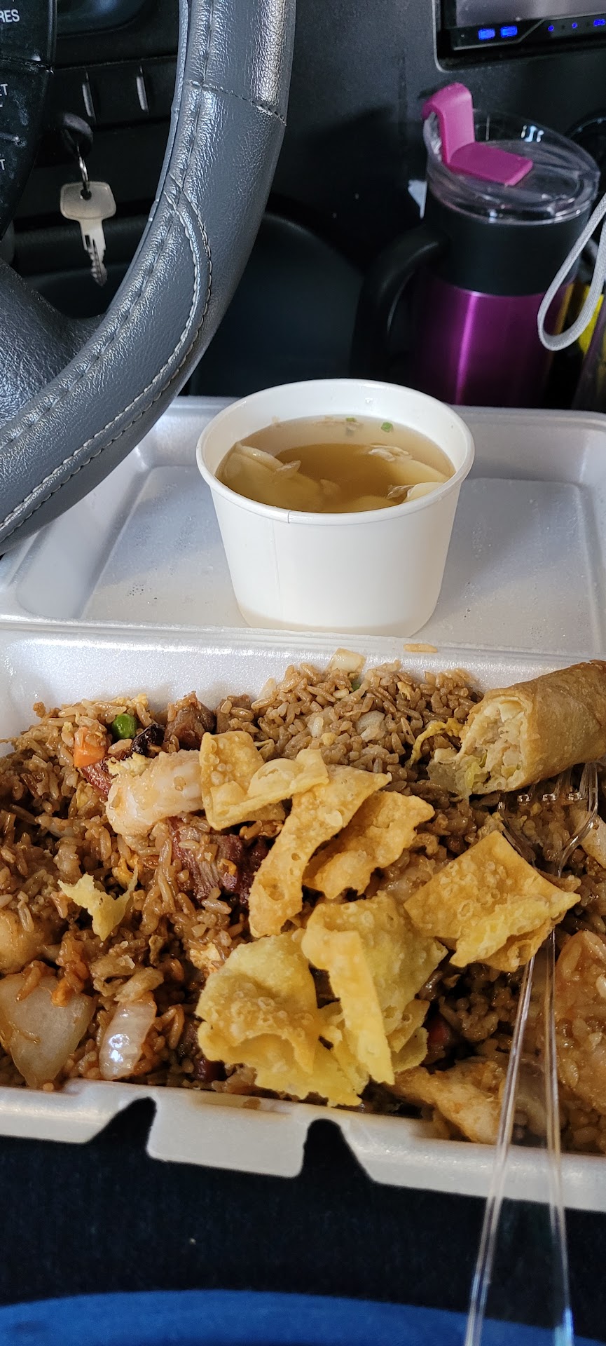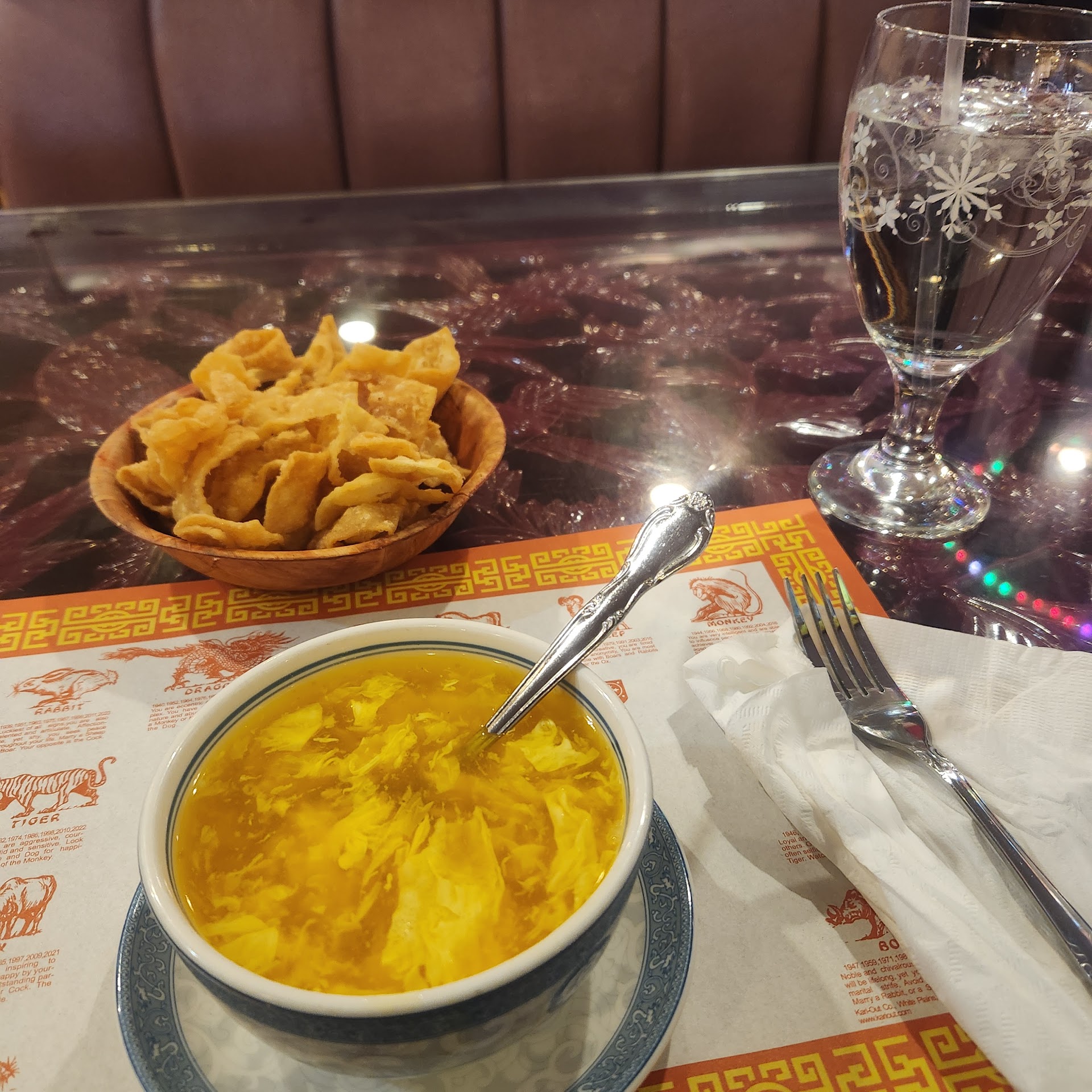 Even though I had a stuffy nose when I entered, there was a very strong smell of flowery disinfectant that never really went away. The place was clean, gorgeous decor in traditional American Chinese. Real glasses set the stage beautifully. The waitress was polite and quick to bring water. She brought the soup and then the egg roll. The egg drop was delicious, and the fried wontons were fresh. The egg roll was more a spring roll but tasted just OK. The carrots in it were huge for an egg roll. And the ends are too greasy. It looked as if they had reheated it. The tofu dish I got was delicious even if It was a little overcooked. The tofu should have been more pillowy and not chewy on the edges. I ordered the deep-fried dumplings to go, and they waited until I was finishing my food to cook it. I hope my daughter likes the General Tso chicken I ordered her. It looks as if it has a lot of vegetables in it. If so, this is a rare place that serves it this way. Most only have a few pieces of broccoli in it. The waitress brought me a delicious coffee jello type dessert that was fabulous. I would order it with a topping of whip cream (not the real cream they use) I am allergic so I had to...