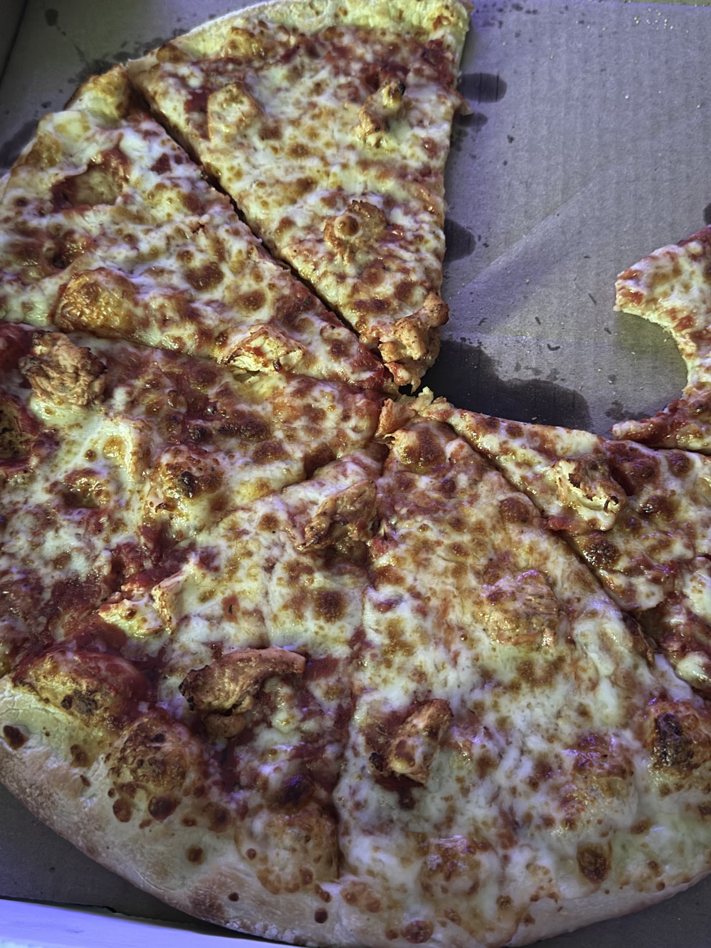 I've been ordering the veggie tandoori papa pan pizza and been getting very little chicken but today was the least I ever got. I asked for extra sauce and tandoori chicken and I must've got 7-10 small pieces on 8 slices of pizza-- you can barely make out the 'extra' sauce and chicken on the pizza below, it was basically cheese bread with veggies.