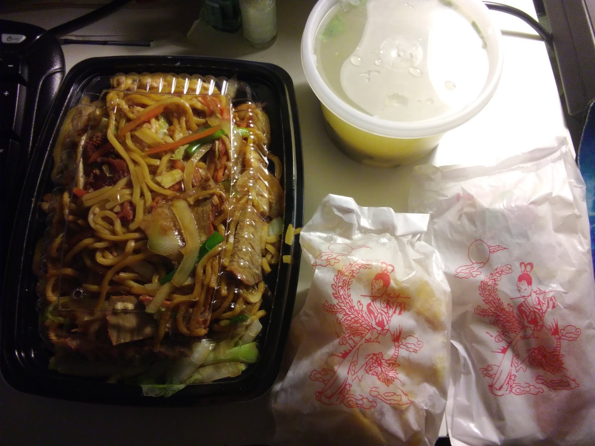 The order came with deep fried egg noodles (or maybe they were wonton), a fortune cookie, some sauces, napkins, and some plastic utensils. There was so much food I could only drink all of the miso by myself and half of the lo mein dish. I shared it with my boyfriend who was impressed as well. The total cost was about $18 to have it delivered. It's WELL worth the price.