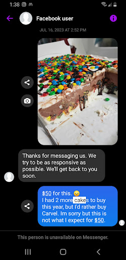 They said their phone lines are weird and they don't usually get their messages. Yet again we are in a position of no cake....