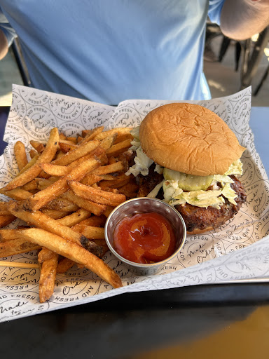Dinner: grilled peach and burrata salad with salmon was delish. Fresh green leaf and lovely gooey burrata. Greens sufficiently dressed not drenched. Salmon had some nice carmelization and not overdone. My partnerās fries were outstanding and the Nashville Chicken Sandwich had a good kick and nice crunch.