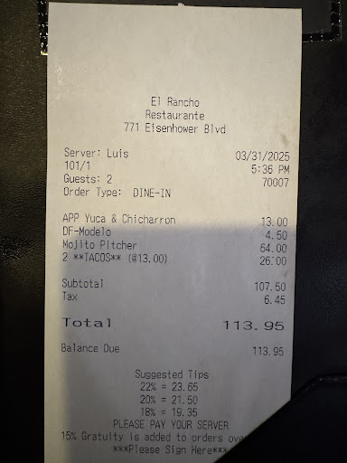 Read moreEl Rancho: A Love Story with a Tragic Ending Walking into El Rancho, I was immediately hit with the kind of warm, inviting atmosphere that makes you think, Yeah, this is gonna be good. And it was. The food? Incredible. The Yuca & Chicharrón? Crispy perfection. The tacos? Flawless. The service? Luis, our waiter, deserves a raise and possibly a statue in his honor.