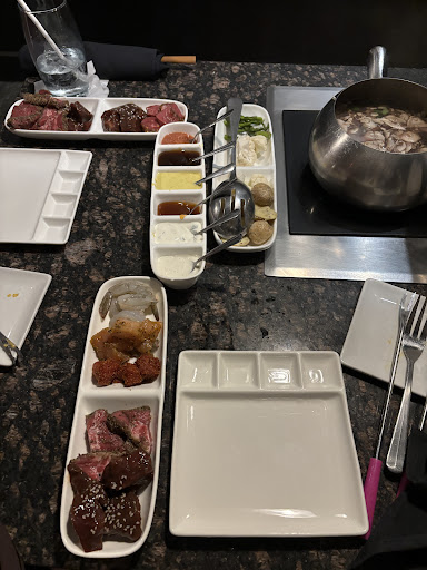 For our entree’s we got Steak Lovers and The Classic to share with Coq Au Vin style. The steaks were good but the pork, chicken, and shrimp were extremely weird tasting as you’re using one pot to cook a bunch of steak and then adding in a whole different type of food. Our pot kept overflowing and it got all over our table despite us sitting there having to blow on it do try and simmer it. This left us with not having enough liquid in our pot to cook the last couple meat items left of our entree as well as the potatoes. We told our waitress and she laughed it off saying she doesn’t care about the mess because she’s not the one who cleans it. Not anything about us losing 1/3 of the liquid in the pot.