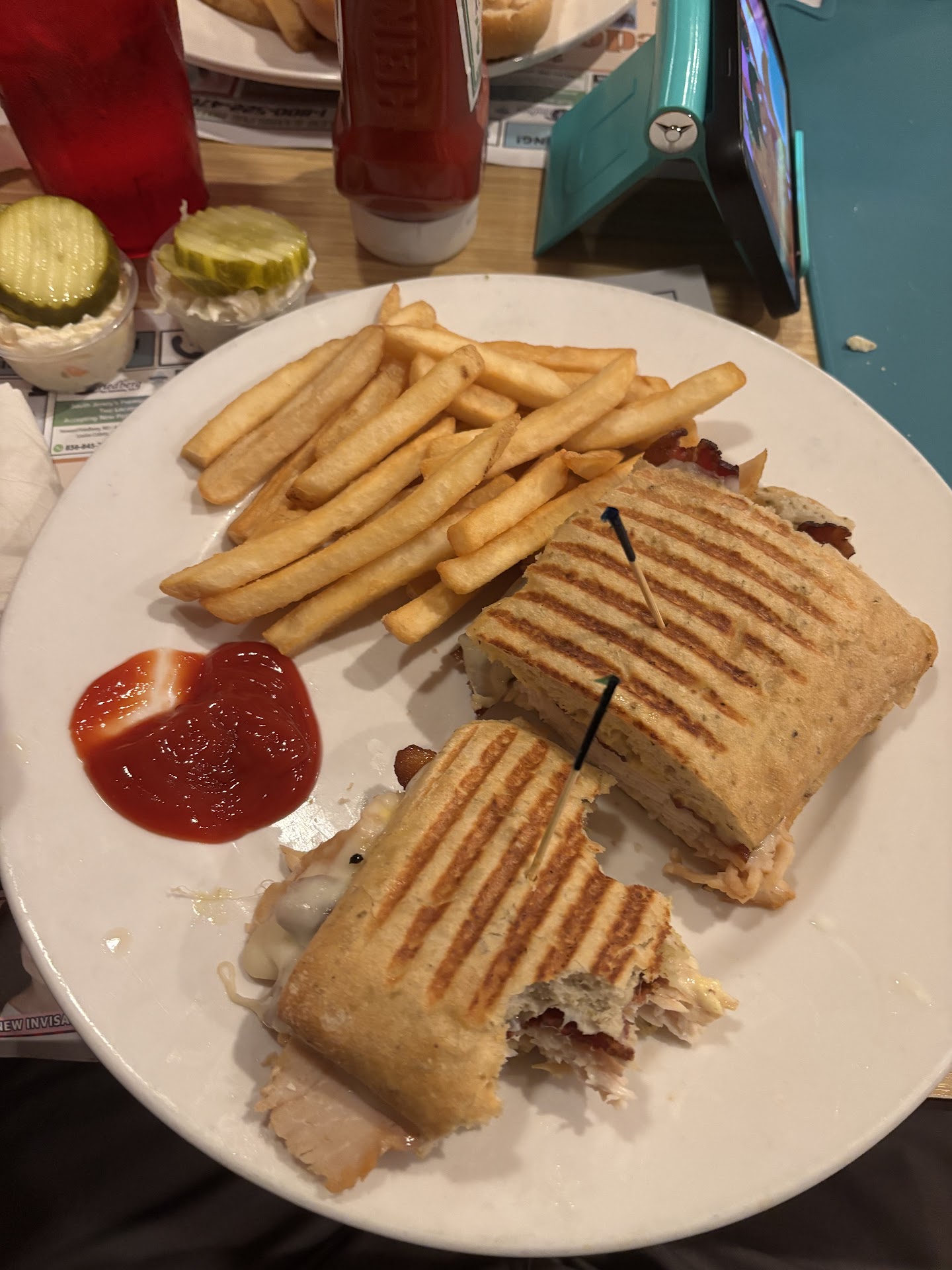 Read moreTLDR: Good food, slow and careless unsanitary service!! Stopped here on a trip, so we were unfamiliar with the area. Saw good ratings so why not.... Full version: Food was good. Took a long while but the food was the best part. So we arrived a little before 7 and stood there for 10 minutes before being acknowledged. It was lively but there were several open tables and nobody else in line. Didn't know if we were supposed to seat ourselves. Our family of 4 was given 2 placemats and no silverware, you know the knife-fork-napkin roll. After we ordered, had to ask 2x for the kid's meals' included drinks. After we ordered it got filled to capacity while we waited and waited. I ask for 2 other place settings since there are four of us (mind you still no napkin-rolled silverware yet) and another waitress tells our waitress she has a napkin stuck to the bottom of her shoe.... She takes off the dirty napkin throws it away and then immediately gets our placemats! Now then and there was there finally urgency to set our table? Real sanitary!! After finally getting our food we have to ask 2x more for the waitress to give us napkins and forks to eat. We settled on only getting 2 napkin-rolled silverware because my son had spaghetti and the rest of us had sandwiches but I'd have preferred to use a fork to clean my plate instead of my fingers. It was pulling teeth to get an extra couple napkins too.