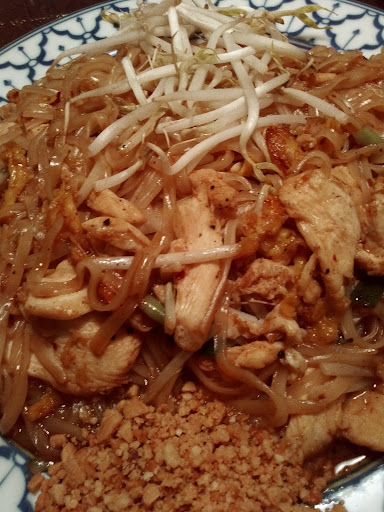 The Pad Kee Mau with beef (dinner-sized portion) was extremely disappointing. It used the wrong kind of noodles--the narrower & smaller rice noodles, not the really thick & extra-wide kind that have a nice soft texture, and they were a little too firm, so they were swimming around in copious amounts of sauce that was very salty and tasted mostly of soy sauce. It's quite possible that other Thai restaurants also serve those regular noodles in this dish, but this is first of numerous times I've ordered Pad Kee Mau across the country where they didn't use the extra large/wide noodles.
