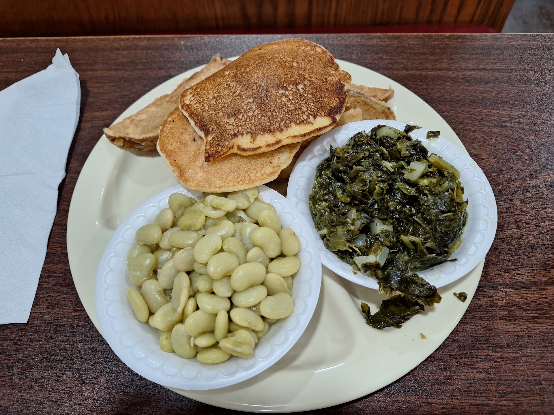 Keep driving, not a good place to stop for food, unless you like filthy floors, ketchup smeared and dried on the walls, musty dirty carpets and flimsy folding tables to eat on. Food was greasy, starchy carbs, and overcooked vegetables and meat. Lot's of fried foods and rolls from the supermarket bags. It's popular with the older locals who seem oblivious to the dismal disgustingly filthy dining room conditions. The sign out front says BBQ with a pig, but that must be from long ago, none to be found here. A good place to get an upset stomach. People in this small town must be desperate...