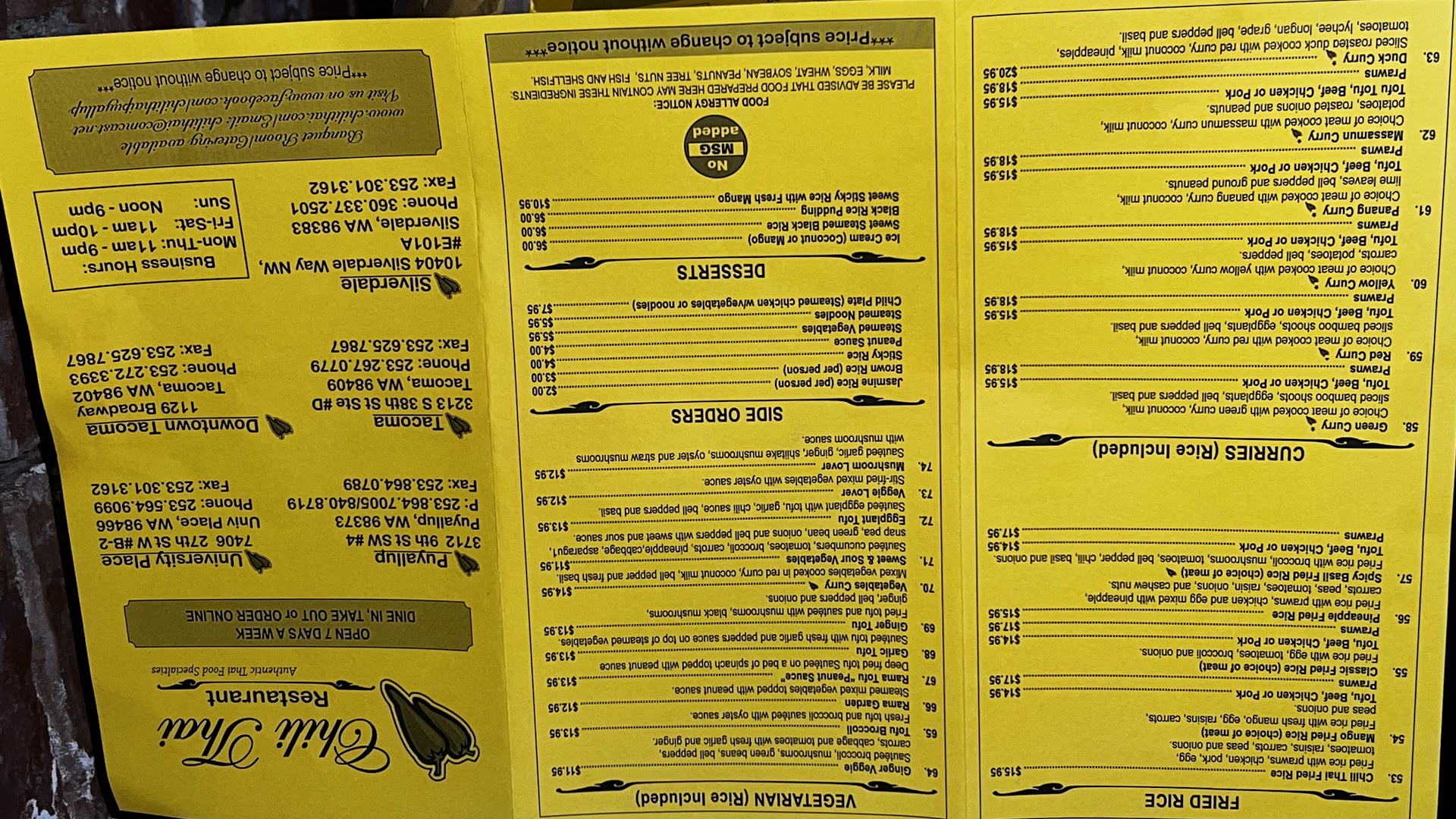 Chili is not a fancy place. It is somewhere between what I would call average dining experience and a hole in the wall from looking at it from the outside. What you receive once you cross the threshold is five star service, delicious, fresh food. (try the red curry salmon. Really. It was unbelievable.) And price that is almost comically low compared to other restaurants in the area. Great place for families. They offer every dish at your own level choice of spiciness (0 to 5). And, again, do everything with a fantastic attitude and a constant smile.