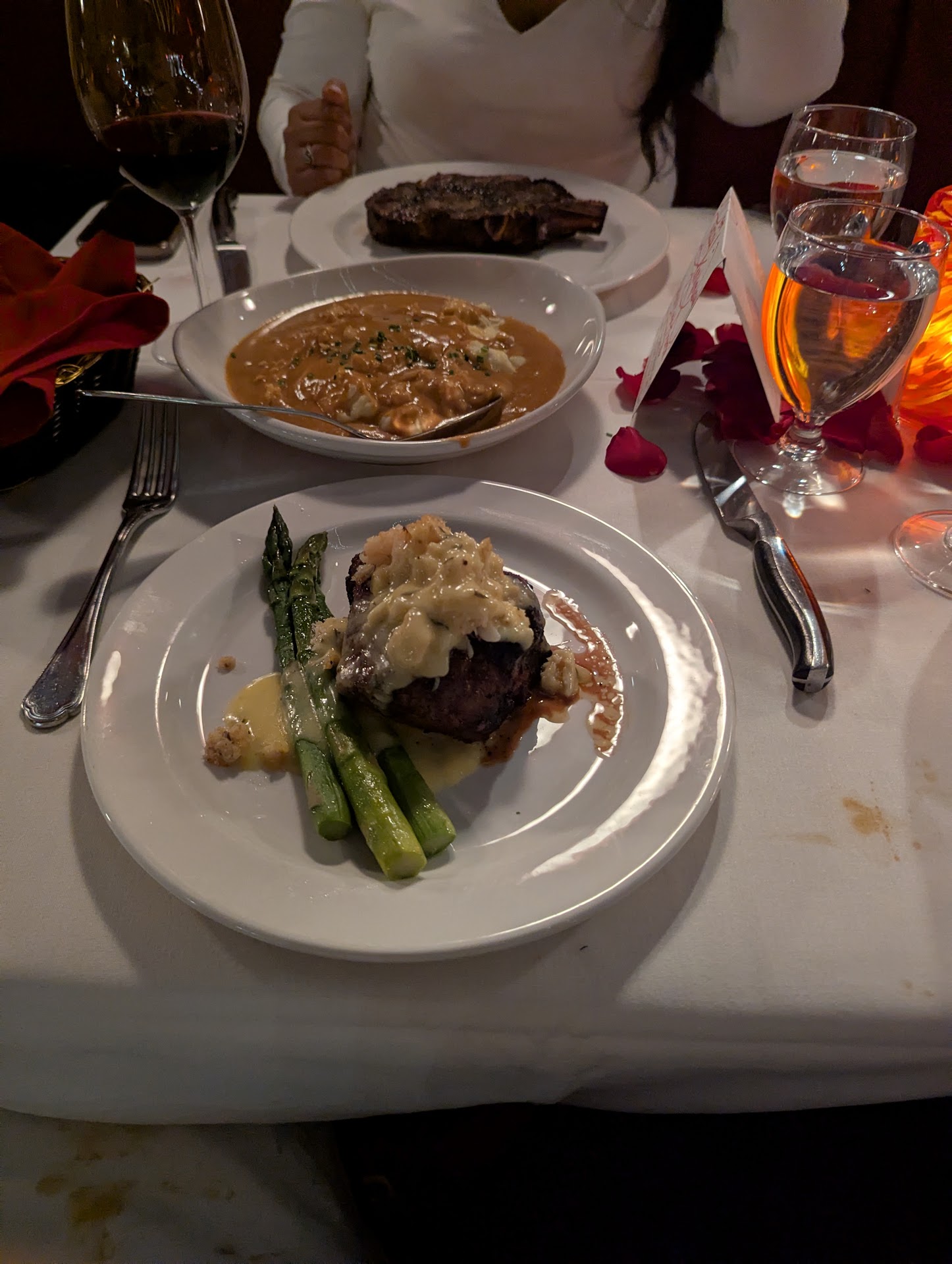 What can I say about the place (sigh)..... My partner and I have been to fine dining establishments in the US and abroad and this is probably the best restaurant we have ever eaten at. It starts with service and the service here is leaps and bounds above anything you could imagine. The employees seem happy to work there and you can definitely tell. They were so friendly and worked so great together as a team. They would actually help each other to achieve total satisfaction for you the patron. They make sure to work quickly and efficiently to make sure your needs are met and you want for nothing. Constantly checking in you giving great recommendations and are knowledgeable about the restaurant history, food, drinks and how what food would please what palate. Even though the place had three stories of seating everything came out quickly. We got served 4 drinks, some prepped tableside, 2 apps, 2 soups, 2 main courses, 2 side dishes, and a tableside prepared dessert all in the span of an hour in a half when ordering everything at different times and asking questions on a busy Friday night with everything coming hot and cooked perfectly with flavor (but more on the food later). They achieved this because of great teamwork and the seeming of them actually wanting to please the patron. The ambience of this place in heavenly. Great live piano player that was great on the keys. Playing any kind of music you can think of. Nice dim lighting. Candle lights, a great lounge area with leather chairs, comfortable seating, great table placement and it smelled divine in there. The food...omg...where do I start. Divine, heavenly, amazing, and worth every penny. The appetizers we had (Korean Pork Belly and Tenderloin Diablo) was literally chef's kiss. The pork belly was crispy, fatty and melted in your mouth. The pickled vegetables were delicious and paired perfectly with the pork belly. The tenderloin tips in the Cajun cream sauce was spectacular. When you dip it with the housemade garlic, parmeasan cheese bread (by itself, it was amazing) was a flavor bomb. The truffle soup was delicious, especially with the ample amount of mushrooms added. The French onion soup was perfection.. the right amount of cheese and sweet onions provided a delicious flavor balance. I had the bone-in ribeye (medium rare) with 3 prawns added on, my partner had the bone-in NY strip (medium) and our side was the crispy brussel sprouts. Great marbel on the ribeye with a true appreciation of char which made the flavoring intense. The NY strip was succulent and flavorful. Each piece of steak melted in your mouth and definitely lived up to the oz advertised (18oz each, respectively). The brussel sprouts were pleasantly charred and balanced with the crispy pancetta. For dessert, we had the Bananas Foster, presented tableside. It was a beautiful fire display. The carmelization on the bananas were top tier, the caramel sauce was sweet, but not overpowering and the two scoops of vanilla bean ice cream brought the dish together. As it was our first time there, our server brought us a fresh fruit and cheese plate to cleanse our palate before dessert, which was unexpected yet greatly appreciated.
