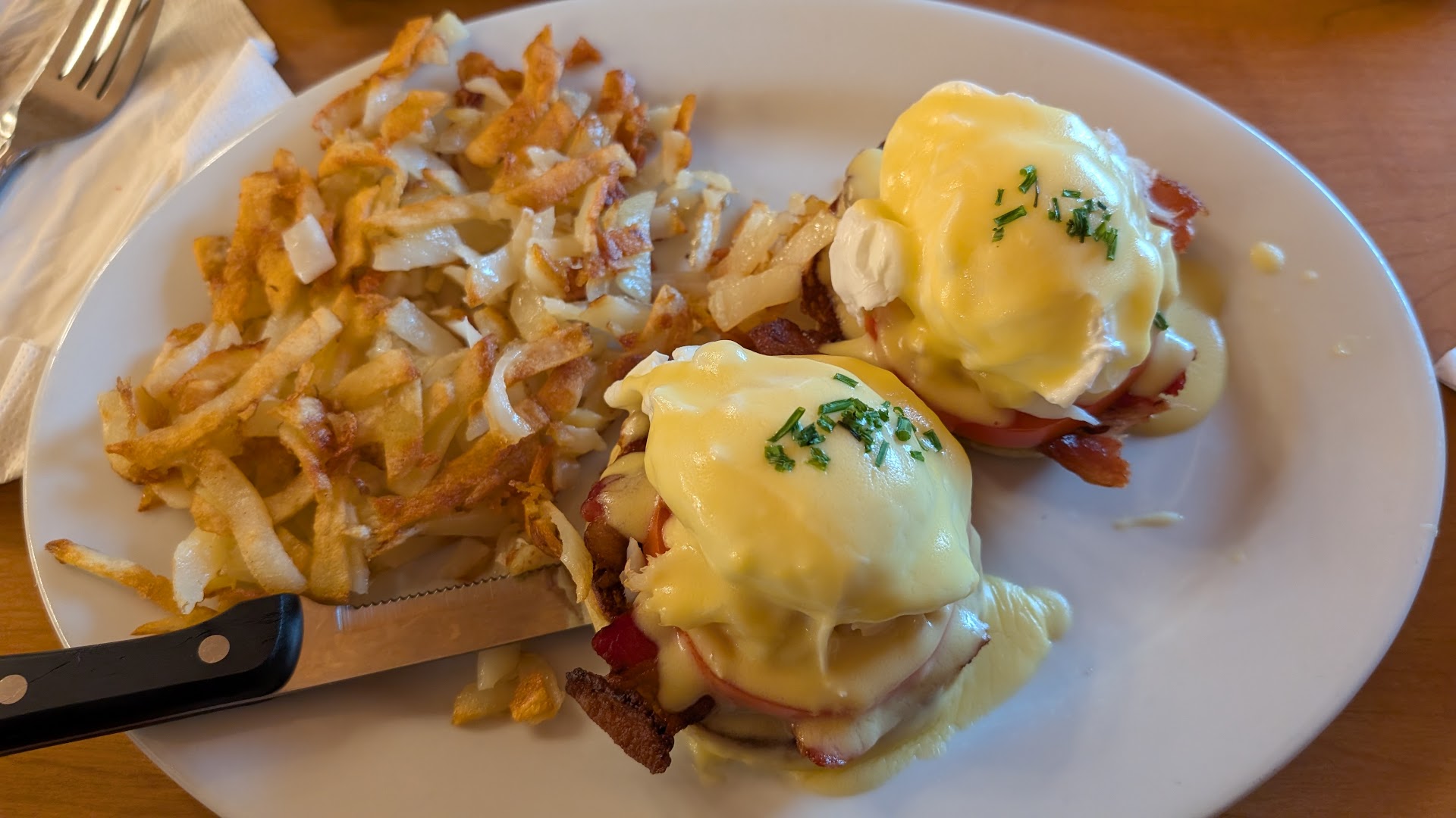 I visited on 6/2/25 ordered the Crabacado omelette with hash browns and it was delicious. I'm not a huge fan of avocados because most people/places use them before they're actually ripe which makes the flavor and texture way wrong for me but the avocado used was perfect, which may have been because it was cooked in the omelette. I was seated and had my order placed quickly because I knew what I wanted due to looking at the menu online before leaving my hotel while deciding where I wanted to eat dinner after being in a training session for work all day. It wasn't even 10 minutes from the time I placed my order to the time my food arrived still hot and steaming. The hash brown was more like large strips of potato shreds but they were cooked perfectly and tasted amazing, especially after a light dusting of salt and pepper to my taste. I ordered a Dr. Pepper which is typically my go to and I was happy to find that the soda syrup to seltzer water ratio was correct.