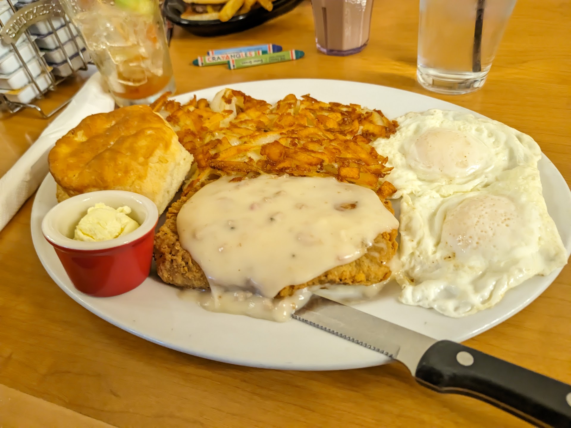 Read moreThe service is the only reason I don't give it a 1-star. I took my wife and twins to this establishment for dinner, our first time. The kids ordered breakfast stuff which seemed to come out fine. I ordered a medium rare steak and over easy eggs. I forget what my wife ordered but it was okay. When my steak came out, it was beyond well-done so I asked if I could get it remade. The rest of the dinner was okay, but when waiting for a total of 45 minutes to get my steak right, it came back to me raw, like they only browned the outsides. Luckily, the server immediately removed this dinner from my check and I had to finish the food from my family to feel somewhat satisfied. And this wasn't even the worst part of our experience. The entire time we were seated, the manager was vacuuming the dining area right next to our table. Here is the worst part of all, the bathrooms were closed down so my daughter and wife couldn't use the restroom and my son couldn't go in and clean his hands. I know we were like an hour away from close, but in my experience as a service worker, you NEVER close the bathrooms before closing and you ALWAYS clean after closing, when all guests have left. Not sure where this manager learned to manage, but he definitely was not courteous to the patrons of his establishment if he closed down bathrooms and vacuumed while we were trying to enjoy ourselves. Definitely will not even attempt to give this place a second chance. Felt like Denny's is a better place to eat than this cut-and-paste breakfast fake-it-til-you-make-it...