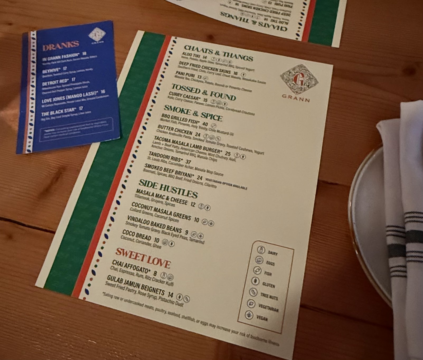We were excited to try this place, we had frequented Our Table before and liked the space but always felt it was a little stiff. The folks at Grann really breathed some life into the spot, made it lively, chic, colorful and welcoming. I like to see a slim menu that is precise, streamlined and well thought out and Grann is checking all the boxes. Drink menu is the same, you can tell there are people with creativity and experience building the drink list. We had the Detroit Red: bold, flavorful, complex and smooth, the In Grann Fashioned: smokey, dark, velvety and strong, the Mango Lassi: thick, tart, sweet and well balanced. The foodâŚsome of the best food Iâve had in Washington. These people arenât playing. There wasnât one thing we tried that wasnât a 10! Pani Puri has always been one of my favorite Indian street foods, I was excited to see the Grann version and it did not disappoint. Fire!!! So flavorful and uniquely made, the crunch and the salty creaminess of the pimento cheese was heaven. It really set the stage for our entrees. When you get the heads along with your shrimp dish you know they are going to be fresh. If youâre not sucking the heads youâre not living. The gravy was bold and savory, shrimp perfectly cooked. I want to talk about the collard greens. The. Best. Iâve. Ever. Had. The coconut masala does something magical here that is hard to explain but it absolutely SLAPS! I could just eat a bowl of that and leave happy. My husbandâs Butter Chicken Agnolotti was creamy and tender, like literally everything else it was bursting with flavor. We finished up with Beignets and they were pillowy soft, subtly sweet with a dusting of pistachio. We wanted to try so much more but the portions sizes were perfect and we were so so full. Canât wait to go back and try every single item on the menu. All together we got: two cocktails, three NA drinks, one app, 3 sides, two entrees, a desert and our bill was 160. I think that is more than fair for what we got. The service was fast, attentive and authentically friendly, the staff genuinely seem to like their jobs and each other. The kitchen churns the dishes out like a well oiled machine, we didnât wait long for any of the food or drinks and the pacing was experienced and efficient. Restaurant and bathrooms were clean and organized. Definitely make a reservation, they get busy and for good reason! It is so refreshing to see a place like this in Tacoma. Itâs bold, unique, well executed but even more than that leaves you with a feeling of contentment transcending feeling full after leaving a restaurant. It almost feels like leaving a dear friend or familyâs house after a lively celebration filled with good food, drinks, music and conversation. Grann feeds your soul too and thatâs truly beautiful. In a time where countless mediocre restaurants are opening up, all selling the same underwhelming dishes, with a redundant whitewashed vibe and high prices, Grann stands out. We...