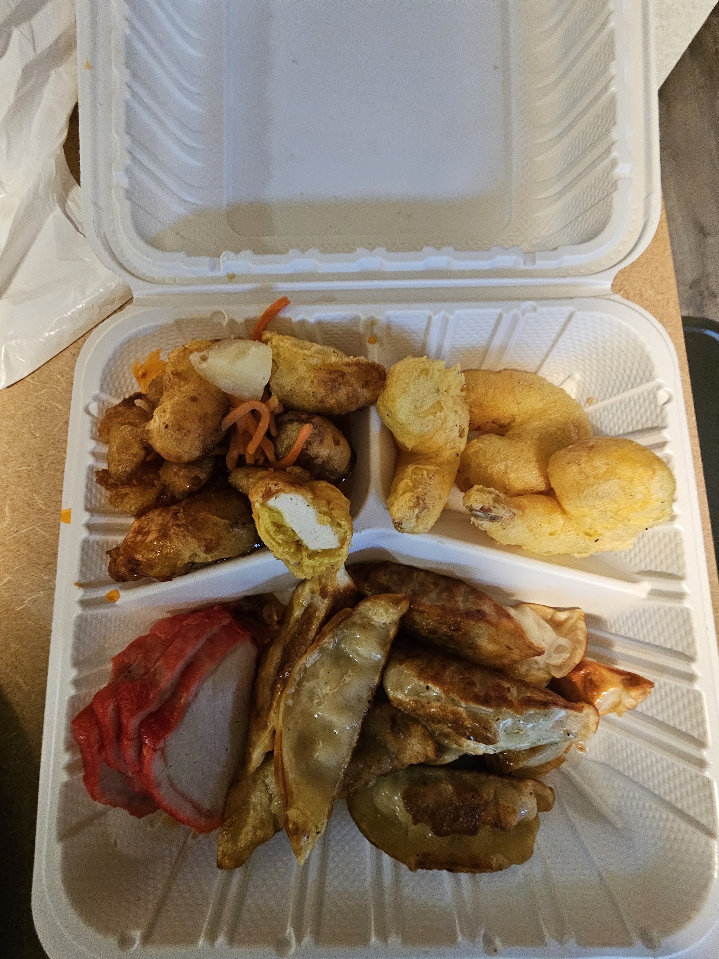 I called in for takeout (which btw, you don't get the soup if you do). It was the personal meal that included Barbecue Pork, sweet and sour chicken, spring rolls, and fried shrimp. At my request, they did replace the spring rolls, with pot stickers, which I appreciated.