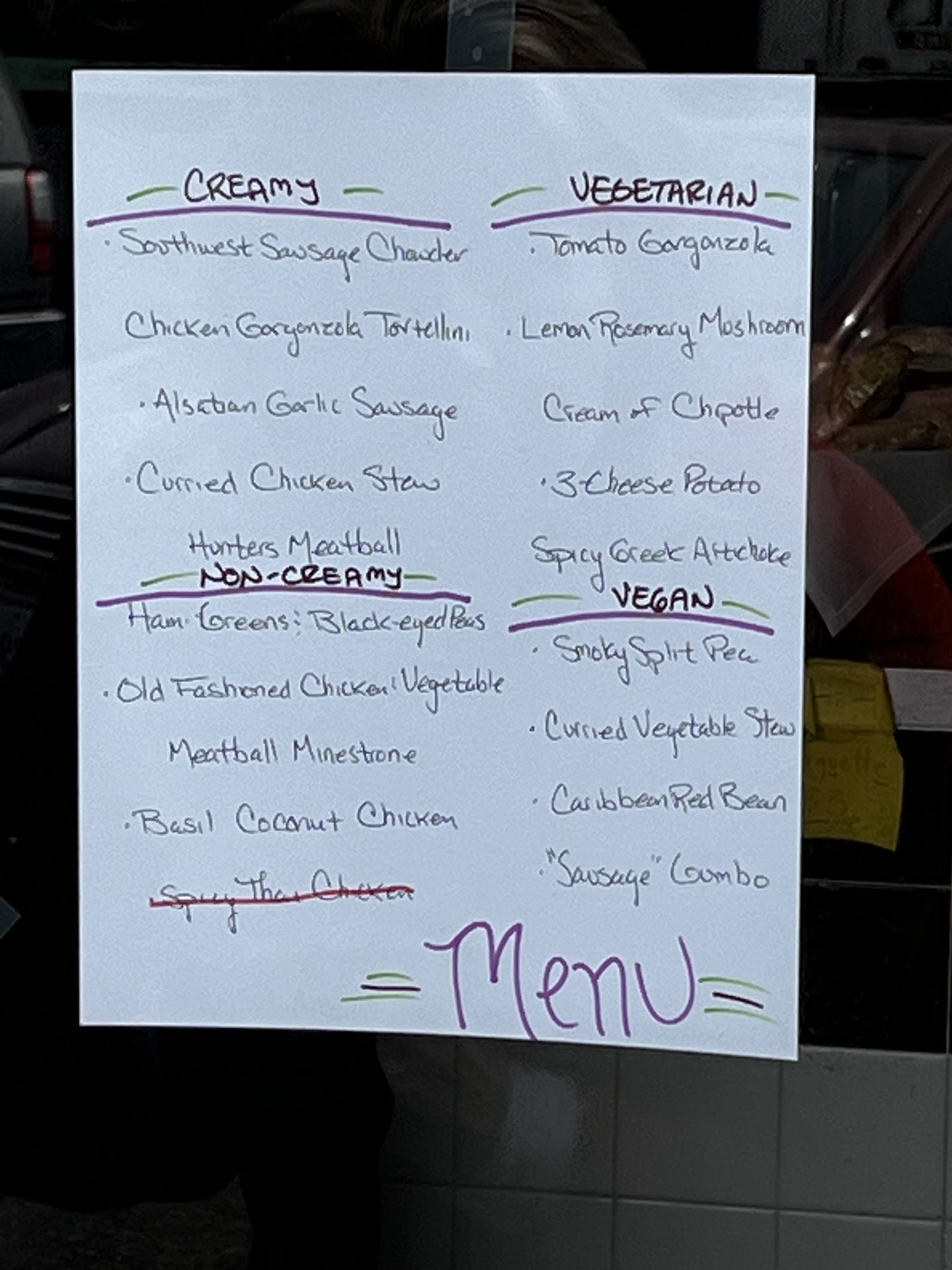 Infinite Soups offers 17-20 soups that are made from scratch every day. There are four categories available: Creamy, Non-Creamy, Vegetarian, and Vegan. If you want to have the most options available to you, you need to get there before 1 PM.