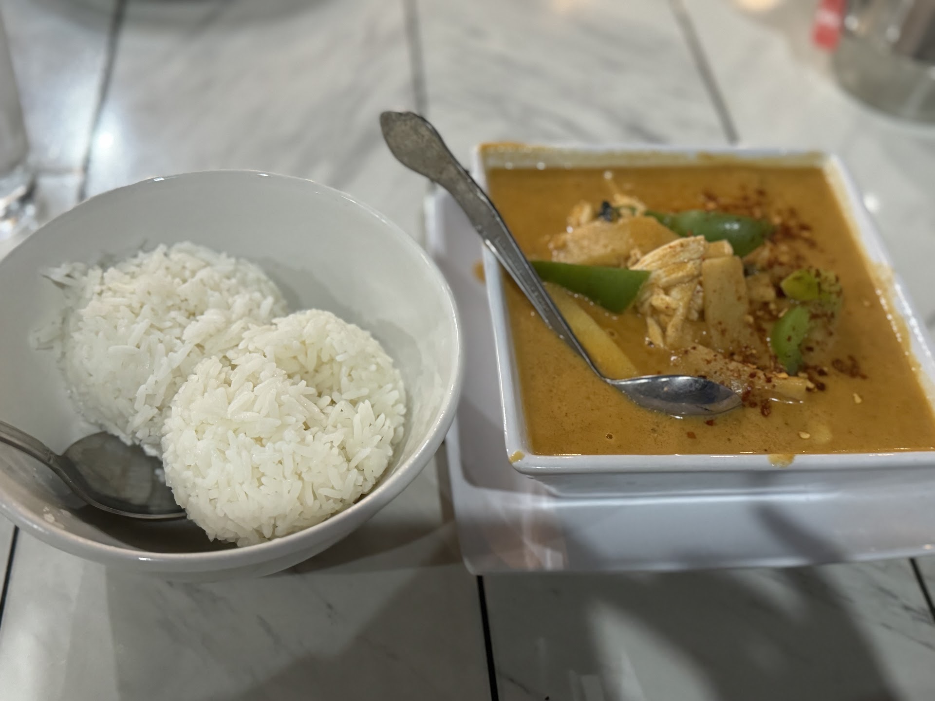 Read moreThis is our first visit to this place. No one geeted us at the door, we stood there for nearly 15 minutes before someone told us that we could sit ourselves. As we sat ouselves, the room temperature is not comfortable chill emanates from our bodies. We were wondering if someone will come to take our order because noone even acknowledged our presence, we were about to walk out when we figured our that we have to get up and give our order to someone behind the plexiglass by the cash register who just stands there observing us. As we give our order, we were told that some of our order is not available although it is on the menu. We have to settle on papaya salad with crispy pork, pad sew and spicy chicken basil. As we settled back at our table, the cashier came out with paper plates, water serve on the fast food cups (coke). When our food arrived, it was serve on a plastic container (to go box less the lid). The flavor of the food is okay. I was expecting shredded chicken versus ground chicken on spicy basil chicken, (minced chicken on the menu) my fault for assuming, never had this before, the pad sew noodle is overcooked. I would classify this establishment as fast food and not a restaurant. Not to mention that toilet has an empty seat protected cover and acrid smell. I will not return to this place nor will recommend it. Sorry just the facts, hope to see an improvement soon or you will loose...