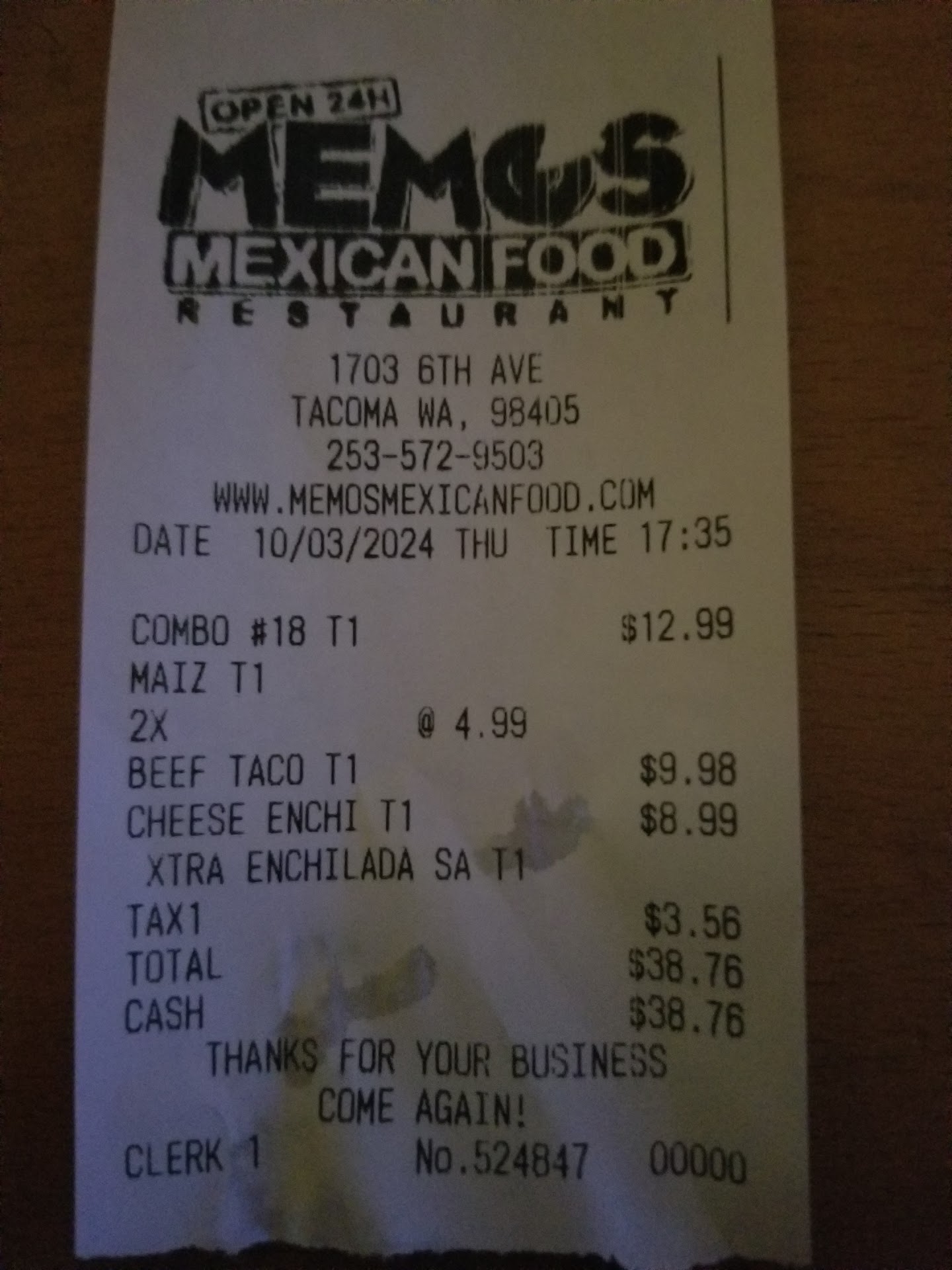 Read moreBUYER BEWARE/CHECK YOUR RECEIPT!!!!! Usually love to stop by Memo's for some fairly authentic Mexican food. I have noticed the prices really starting to jump and change more frequently, though. But what I experienced today was new and people need to be forewarned! CHECK YOUR RECEIPTS (also make sure you get a RECEIPT). I was surprised after paying the said amount that the actual prices listed on the receipt, including tax, did NOT ADD UP TO THE TOTAL that I was charged which was what was shown on the receipt. I couldn't believe that was possible because it was the receipt printout from their register, but sure enough (see photo), those listed prices PLUS the tax add up to $35.52...THREE dollars and 24 cents difference that was charged and then collected on! I was still on-site when I reviewed the receipt and realized this, so I parked and went back in and told them their receipt didn't add up. They, of course, didn't know what I was talking about and I had to show them on my phone calculator how the listed prices and then adding the tax shown did NOT add up to the total on the receipt. They then tried to explain it was the extra sauce I ordered which is shown on the receipt and also shown to have no charge associated with it...even if that was somehow the case, THREE dollars for some extra sauce on the item that already comes with the same sauce?!?!? And even then, you can't say you're charging me for it and then it doesn't show the charge on the receipt! There next attempt was to point to the menu on the inside of the store and say the various prices were different/more...so what if they were, the RECEIPT from my purchase was wrong and overcharged me by about 10%. I wonder if this happens with all of their transactions or if it's some glitch in their computer/register system, but you can't run a business like that, so I'm not saying stay away (because the food is pretty good), but double-/triple check your receipts and make sure everything is checking out. They did pay me back the difference in cash, although that was a struggle with them knowing the difference in the overcharge, first trying to hand me $2.24 and then I had to insist for the third dollar which generated the sarcastic response from the "manager" of "here, what, you...