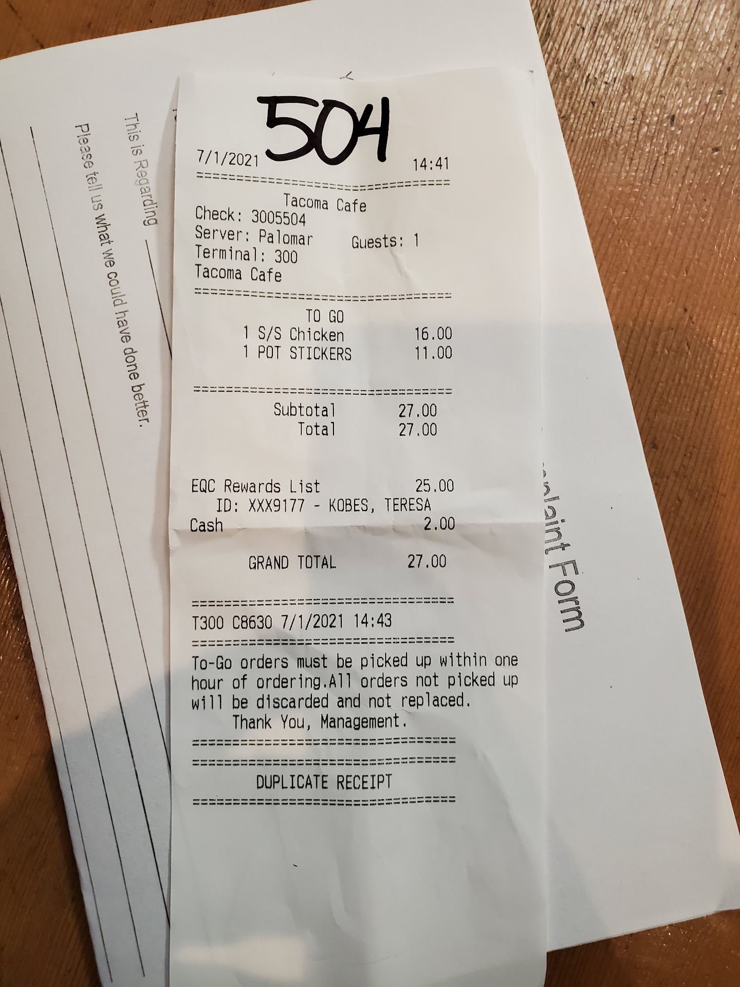 I wait a few more minutes outside the restaurant and see a lady picking up a huge order, I see her order number is 510. My order number was 504. I ask her if she waited over an hour for her food and she said "not at all." At this point I leave. So I'm out my $25 food credit, cash tip and the difference I was charged. Needless to say I will not be going back. You would think places that you spend a ton of money at would care a little more about keeping you around.