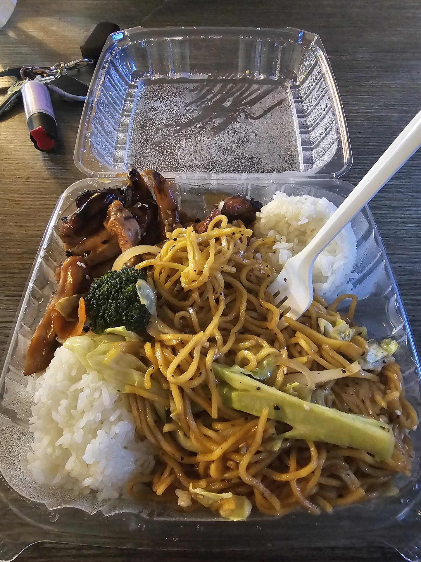Read moreSo, right off the bat I'll say why I'm going with 3 stars and not higher: the low food safety rating on the door, the cockroach I saw running around, and how upset my stomach was after dining here. The woman who took my order wasn't friendly. The general tso was remarkably crispy but it seems the norm these days to throw frozen peas and diced carrots in teriyaki dishes. This makes the dish come across as cheap. The flavor wasn't much to write home about but on par with most teriyaki places. Honestly it's like these places gave up trying in the 80's. Really, 1 star is appropriate but I have to be fair and judge based on the type of restaurant and lower my standards accordingly. If they put in the effort to being cleaner and safer I would think them better than most places but from what I experienced and saw I don't think it's...