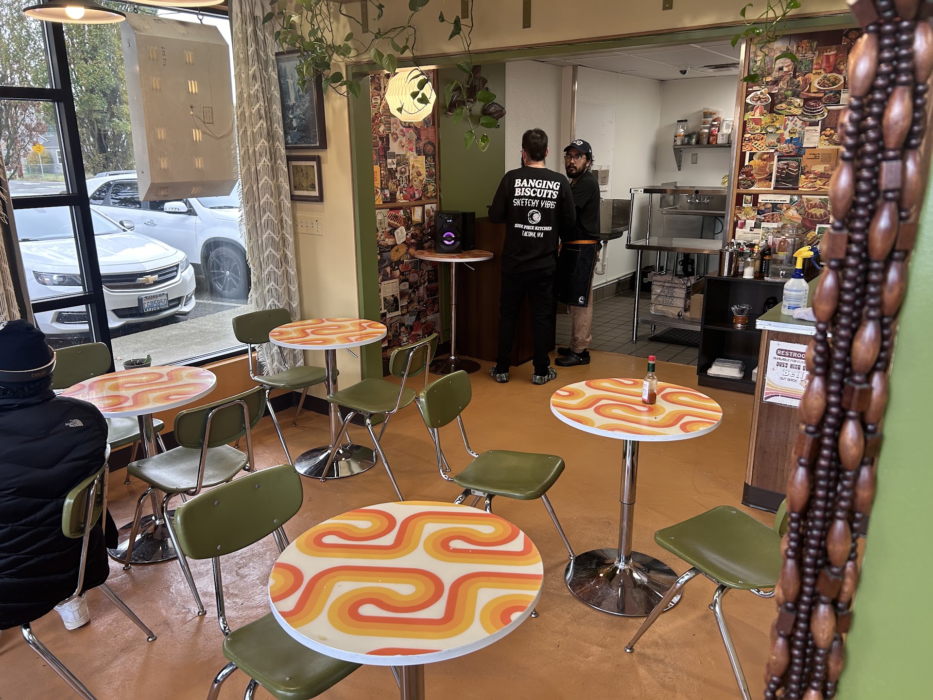 Ā Ā Ā Read moreI'm torn about how to write this review and I'm going to give it another shot but for now, here we go. The three stars is purely for the food. The service was warm and friendly with just a hint of sass which for me is perfect! The atmosphere is fun, crazy, almost dive bar meets kitchy, meets retro. The mimosa I had while waiting was proper strong and delicious! Food came out reasonably fast considering how busy they were (line out the door and packed space) That's where the good ends. Now for the ok. Seating is EXTREMELY limited. Not their fault, but I hadn't planned on taking my food to go. I live 40 minutes away and this isn't really the style of food that holds up well to travel if you want the best experience. Also, no utensils (edit as owner responded below saying there was on the counter. I went back in and looked and only saw metal utensils but must have missed the disposable, so my fault there), so car eating was out for me. I got the Stoner SOS because I absolutely love a good set of biscuits and gravy. I tried the bacon before I drove off and that was my first disappointment. It was chewy instead of crisp. As a former chef I know how hard it is to get thick cut bacon to be nice and crispy. You damn well need to burn it! I totally get opting for going a bit underdone to keep the visual presentation nice, but not the way I would have preferred it. When I finally got home I was able to dig into the rest. Now, I was and am completely aware that things were going to get soggy, and am not knocking any points for that after an almost hour drive (traffic was ridiculous) and the food was still warm. My issues were that the Mama's aoili, pickles jalapenos, and pickled onions absolutely overpowered everything. All I could really taste was sour with a hint of the gravy coming through. I went a couple bites this way to make sure I didn't just get a bad spot, but nope. FYI, I LOVE sour and pickled things. Not when it's overpowering everything else though. So after removing the jalapenos and onions it was much better but still underwhelming considering the praise this place gets. I was expecting (I know, my fault) mouth blowing, almost orgasmic, tongue slapping your brains out delicious. What I got was just good, but not great. This is all taking into account giving quite a bit of slack considering the drive. I'm willing to give the place another chance as maybe I just picked the entire wrong thing, but I don't know if I'll go out of my way for it. Will happily change my review if it turns out I just...