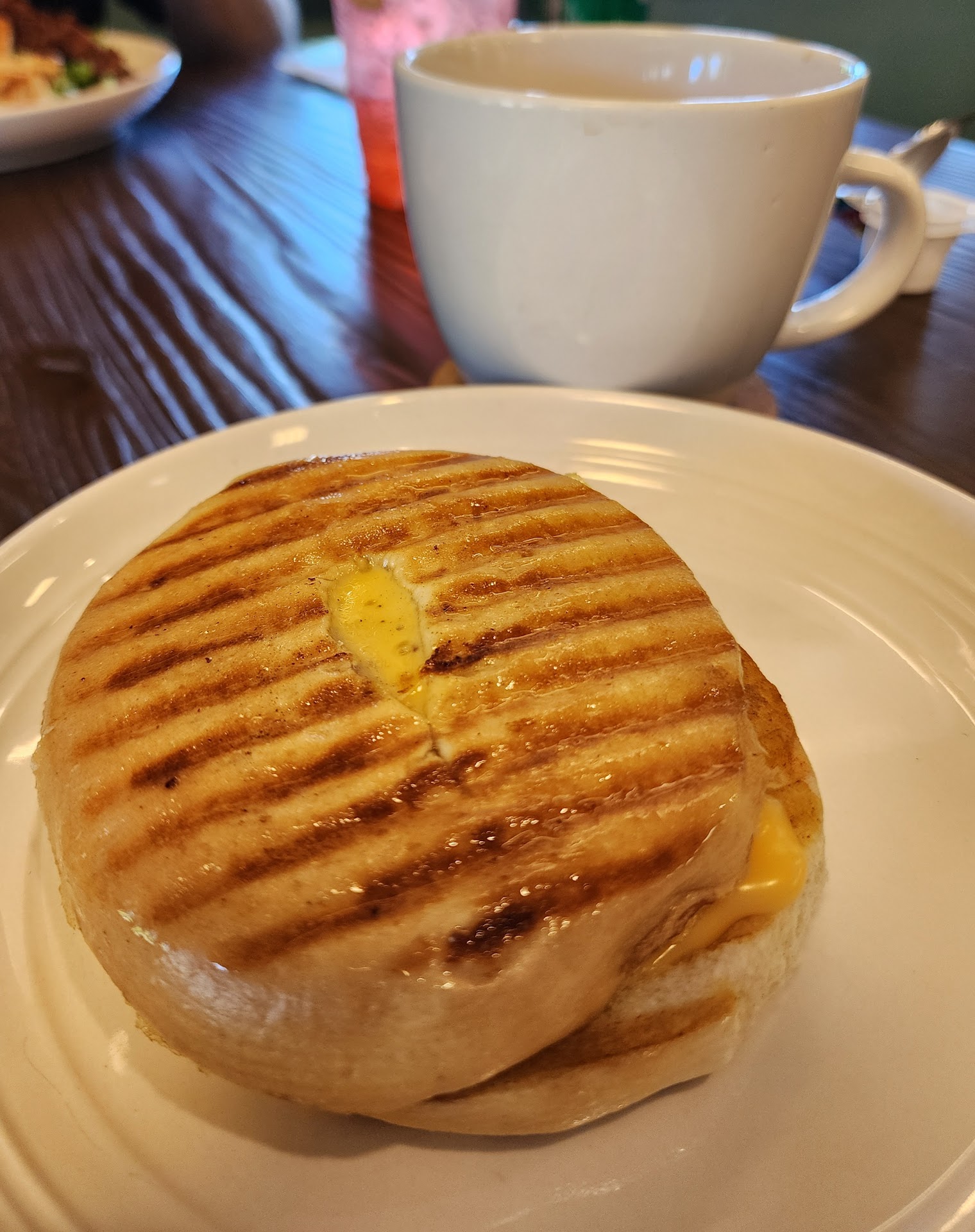 I had the sausage egg and cheese on a bagel, which they put in a panini press so it's perfectly crispy without being burnt, melty cheese and perfect eggs. I had the drip coffee to drink, which was served in a large mug with avaliable refills. Drip coffee can often be mid, burnt, or just plain, but I was really suprised by how good it was here.