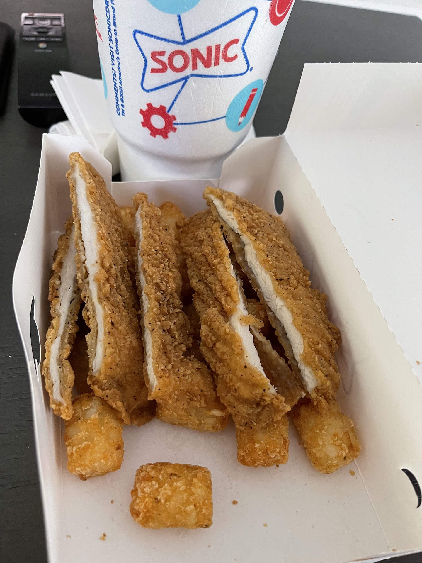 Read moreDisorganized. I got the large chicken sandwich. I hate to think how small the regular chicken sandwich is. At least fifty per cent breading, which was fried to a crunchy texture. Some of the chicken breast was less than a quarter of an inch thick. I think they were out of the largel chicken and served a small to me. Nothing was bad but nothing was really good. I won't give them another chance. The owner of the store sent a message to me on here. There was a link included which wasn't working. But that's impressive that they responded so quickly. In light of that I'll give more information. I think Sonic is from California. The first one i saw was in Texas. They moved into the east coast, gosh, must have been in the eighties. What i remember is multiple milk shake flavors. I don't remember car hops in Daytona Sonic. To me that was the best of the fifties a hopping burger joint with car service. I fully appreciate how hard it is to run a franchise. Since i was in the drive thru i didn't get to look inside. Most of the fast food places are take out only since COVID. But the exterior was clean and tidy and showed no disrepair. I'm not sure if the exact time, but i bought the ferry ticket back to the island at 11:03. So i was ordering lunch between 10:30 and 10:45. A personable, even friendly sounding young lady took our order thru the intercom. We pulled to the window, and she was friendly and pert. I gave her the wrong card, she ran the other one and i asked if i could pay in cash, there was a "no change available" sign. And i had just realized that they could keep the change. She had given us our drinks and walked away, i was assuming to get the food, when another young man came up and started to pour out drinks again. I told him we already had them. I heard her saying it from the rear of the kitchen, "they've already paid". At that point we waited. The cars (3) stacked up behind us. I offered to pull around so they could be served. Maybe it was break time, maybe she had an emergency maybe the chicken was frozen. So i mentioned the crispy crunchy breading, really well done. The two ounce chicken portion was a joke. The French fries had a peculiar flavor. I was thinking fried fish? From the oil. There was a crisp leaf of lettuce and a slice of tomato. So unless i went to a nearby high school and knew the kids that worked there and there was a party in the parking lot. The food just didn't cut it. The root beer was good and he gave me a refill since i drank the first one waiting. Great TV ads...
